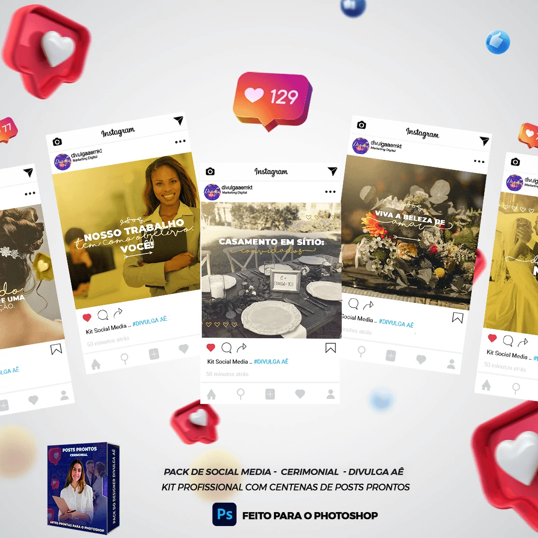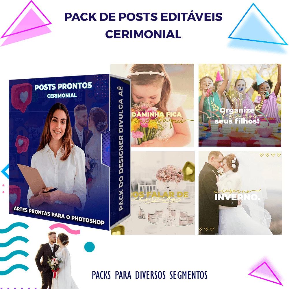 Pack elaborado sob demanda com mais de 130 artes, para Cerimonial – Organização de eventos  e designer gráfico que precisa elaborar posts de forma rápida e prática, bastando somente possuir o Photoshop ou acesso ao Photopea  para editar os arquivos e colocar a marca da empresa, alterar o nome, e adicionar o WhatsApp, tudo em poucos segundos!