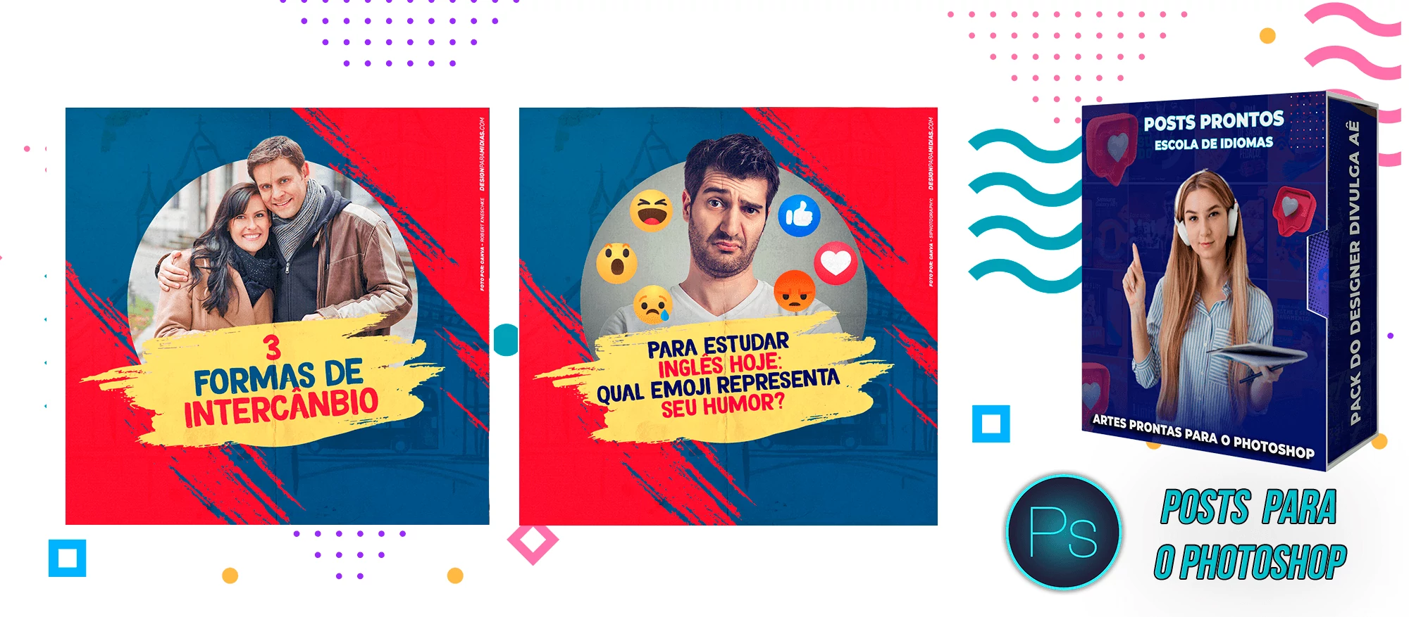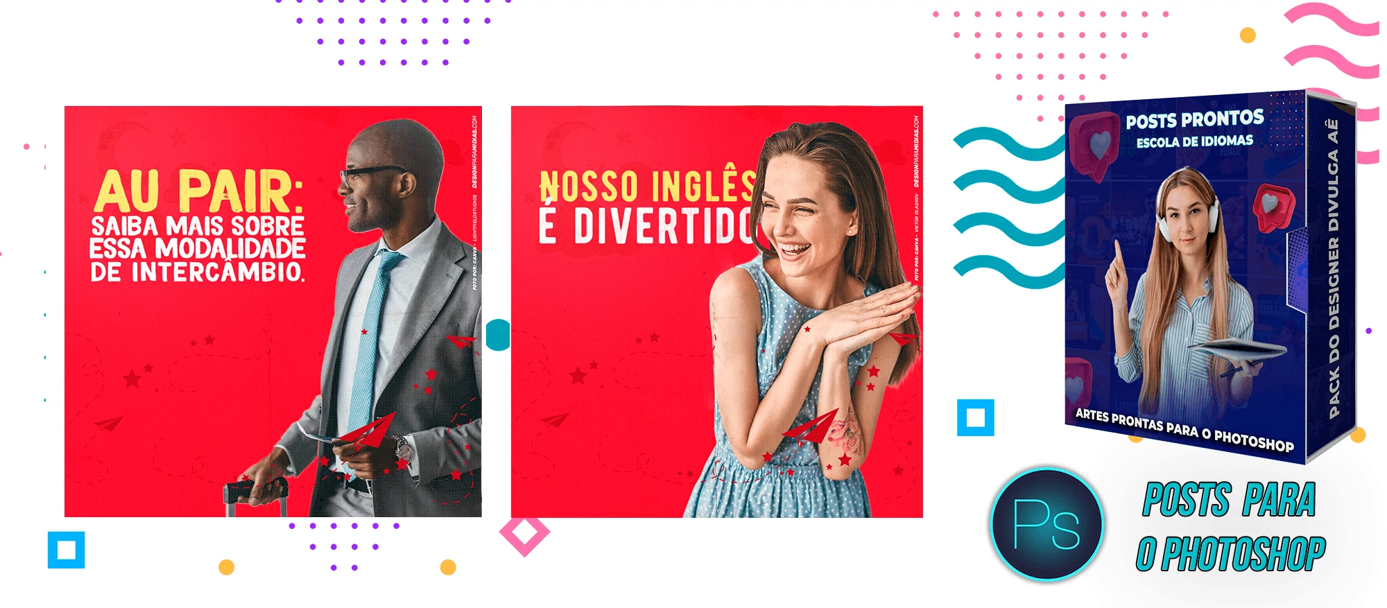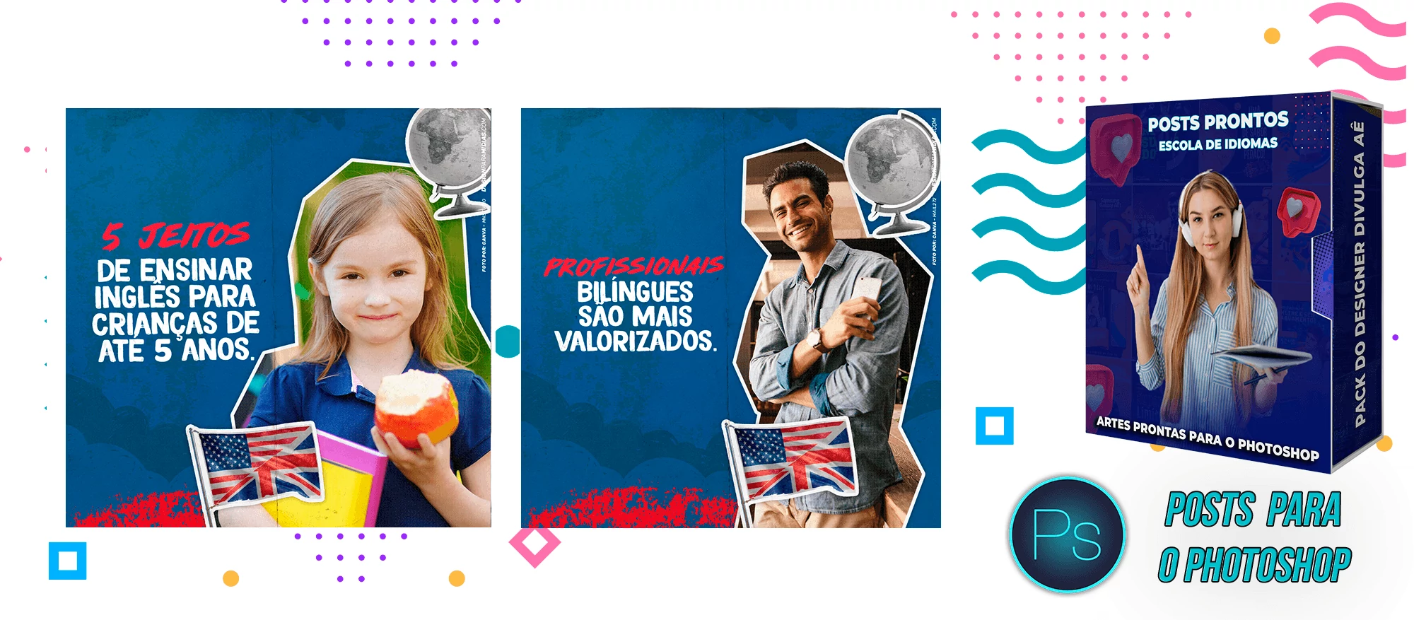 Pack de Posts 100% Editáveis elaborados sob demanda,  para  Escolas, Cursos de Inglês,  Intercâmbio, Cursos de Idiomas  e Designer que precisa elaborar artes para escolas, cursos de Idiomas, EAD e muito mais, bastando apenas possuir o  Photoshop editar o Arquivo e colocar a marca da empresa, alterar o nome, e adicionar o Whatsapp, tudo em poucos segundos!