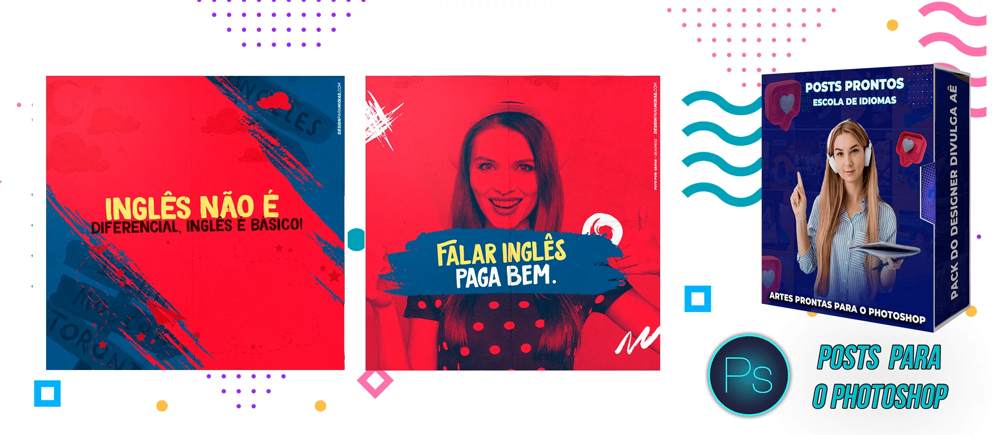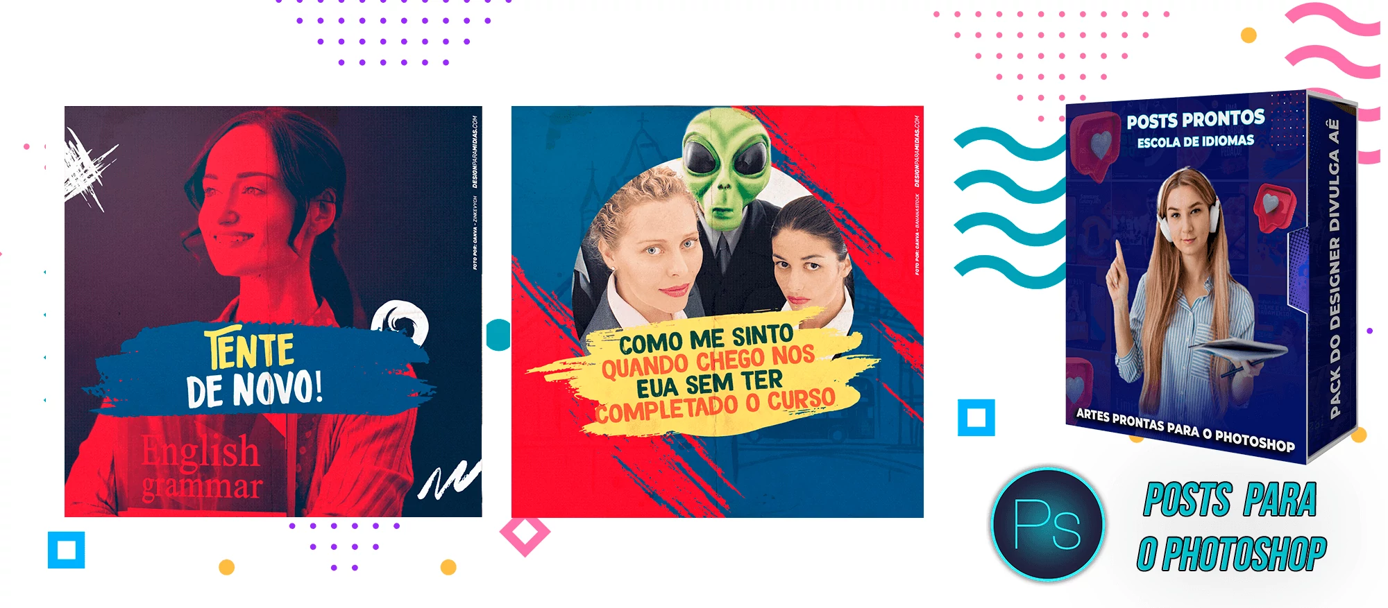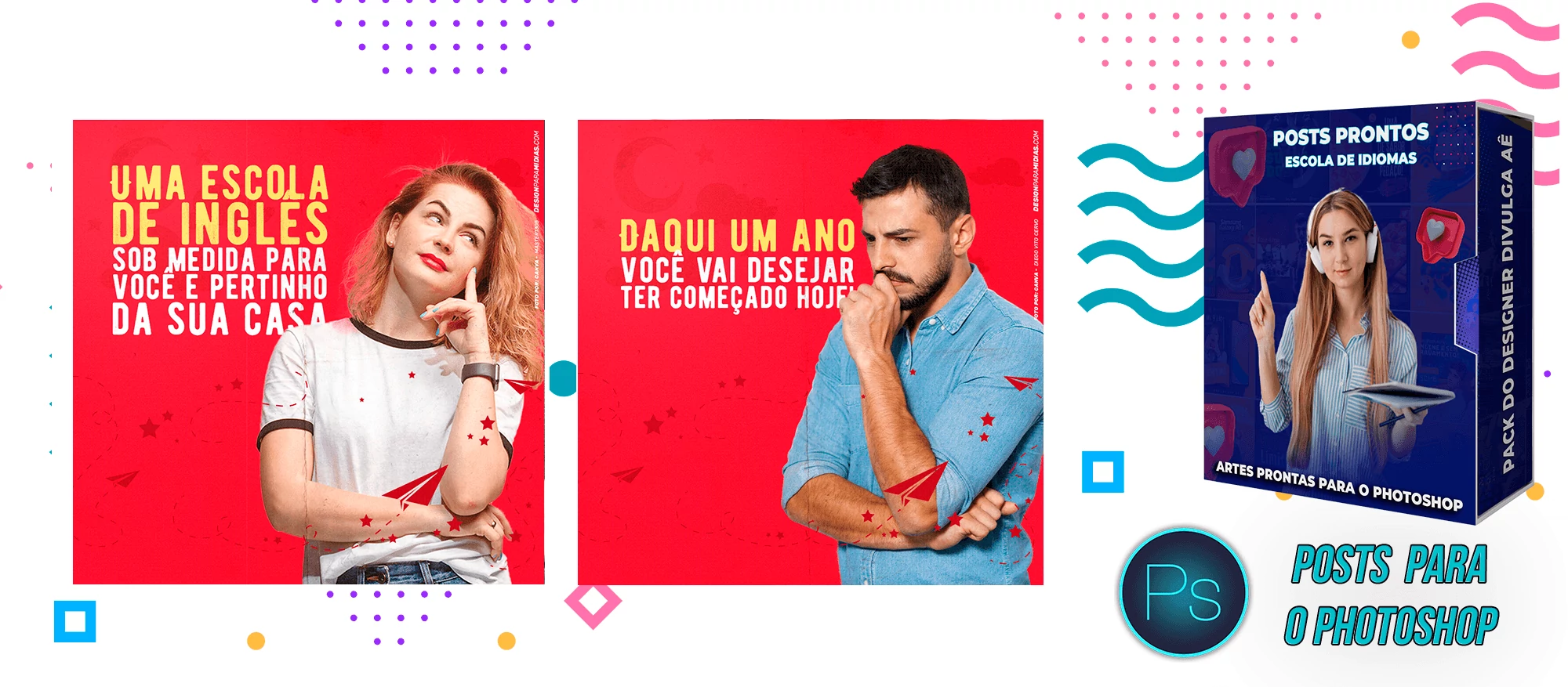 Pack de Posts 100% Editáveis elaborados sob demanda,  para  Escolas, Cursos de Inglês,  Intercâmbio, Cursos de Idiomas  e Designer que precisa elaborar artes para escolas, cursos de Idiomas, EAD e muito mais, bastando apenas possuir o  Photoshop editar o Arquivo e colocar a marca da empresa, alterar o nome, e adicionar o Whatsapp, tudo em poucos segundos!
