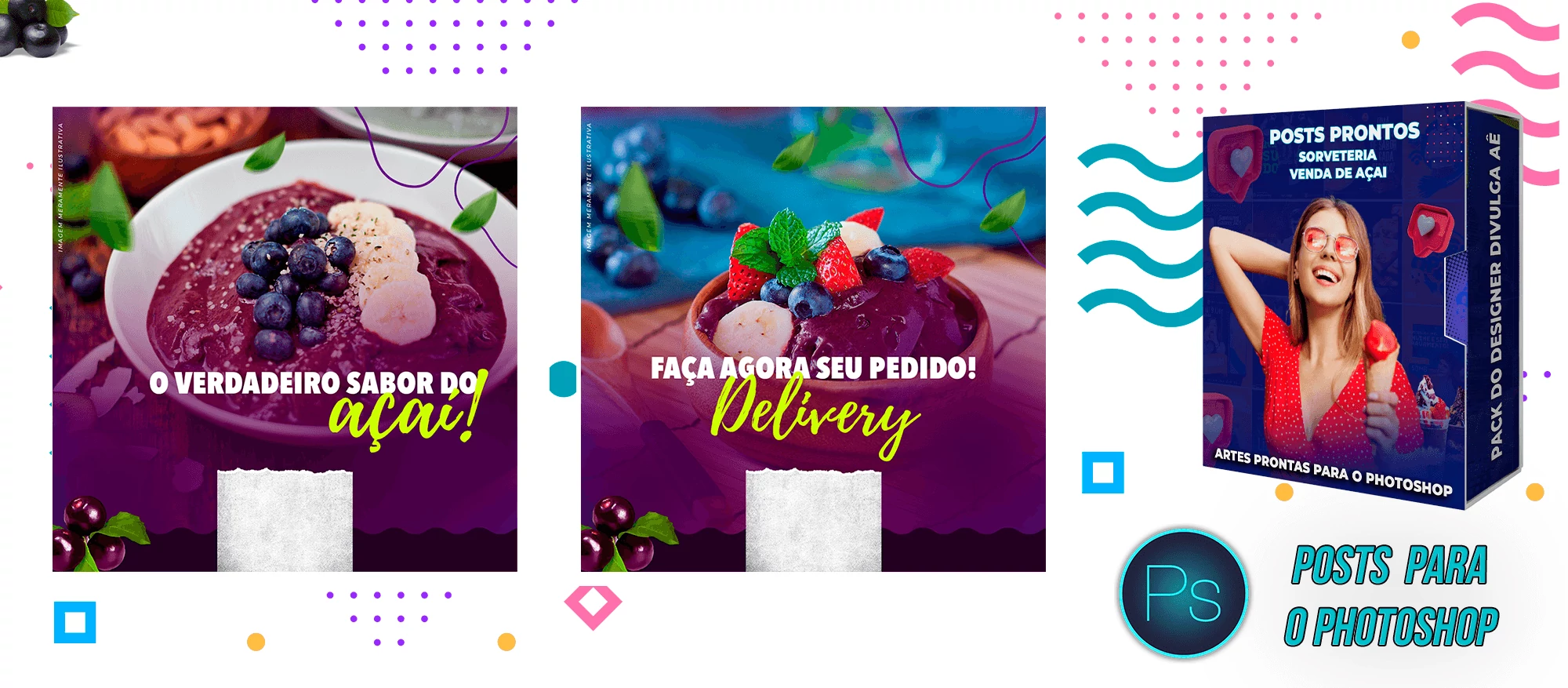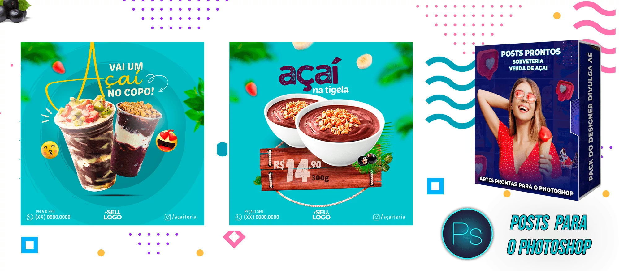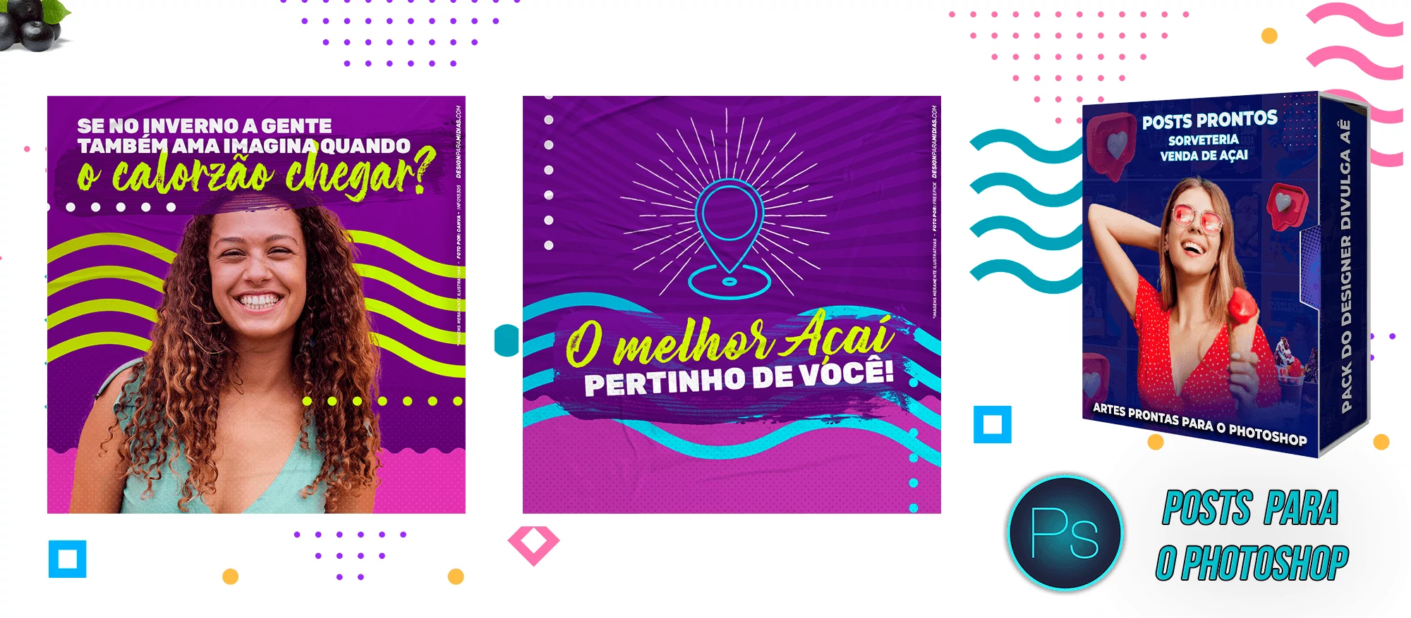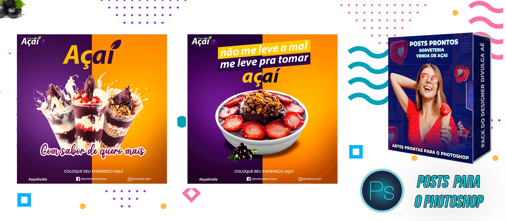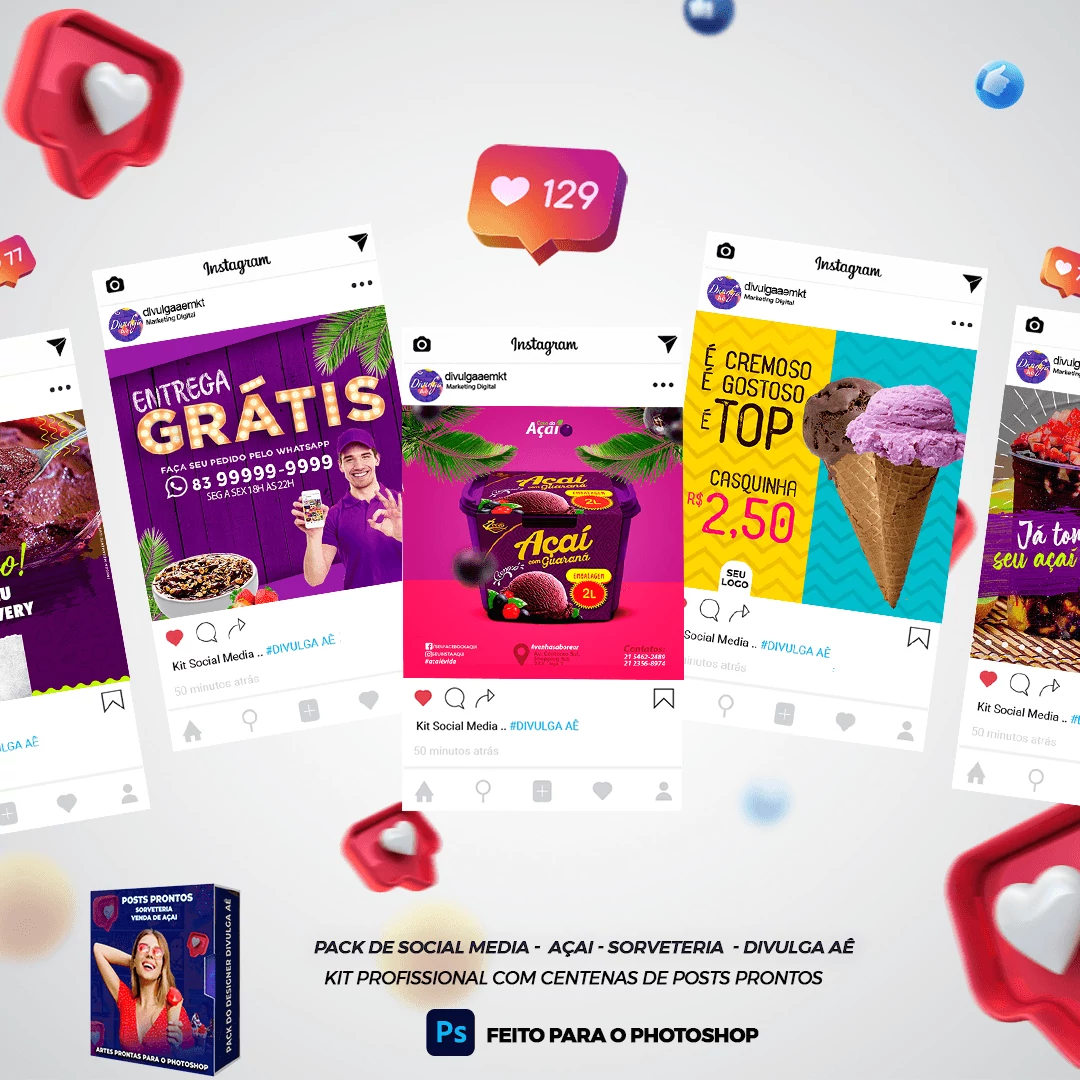 Pack de Posts Prontos e Legenda – Venda de Açai e Sorveteria no Photoshop