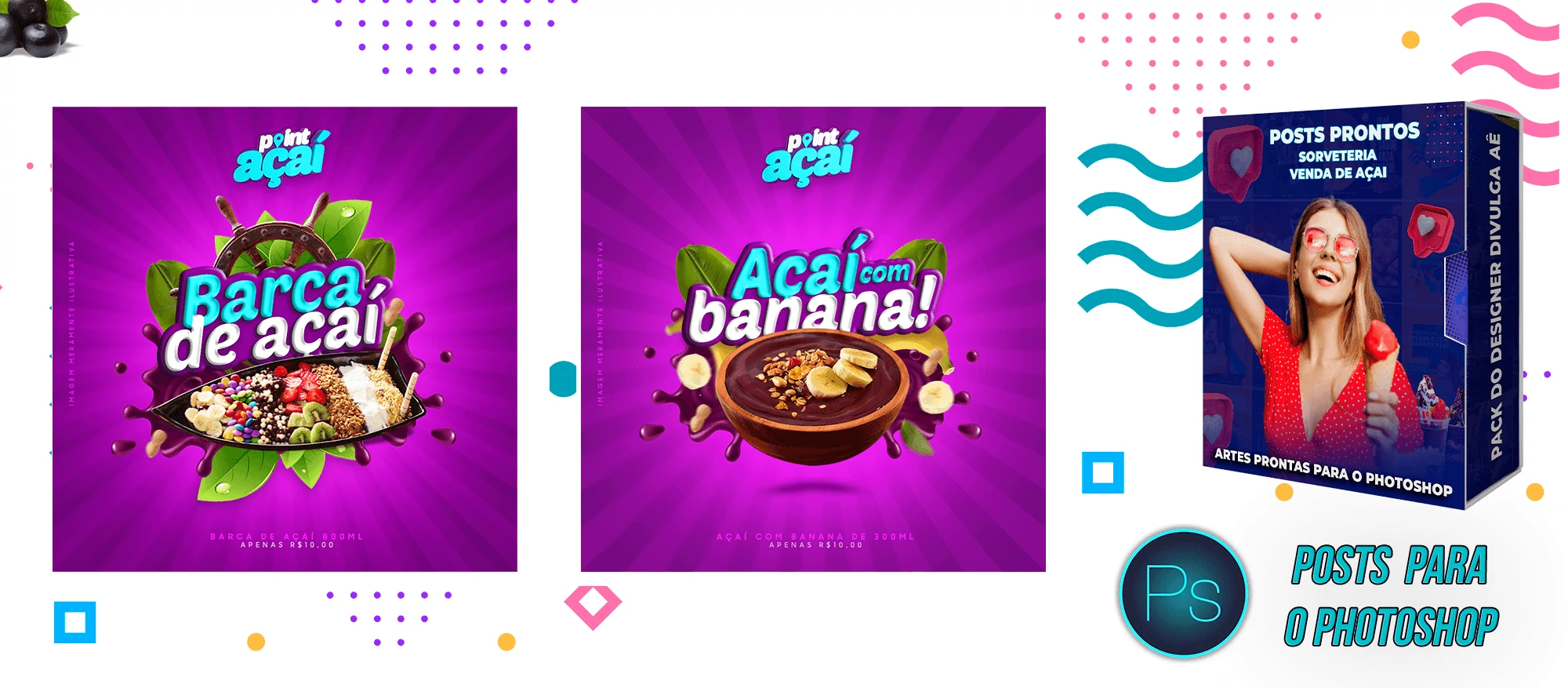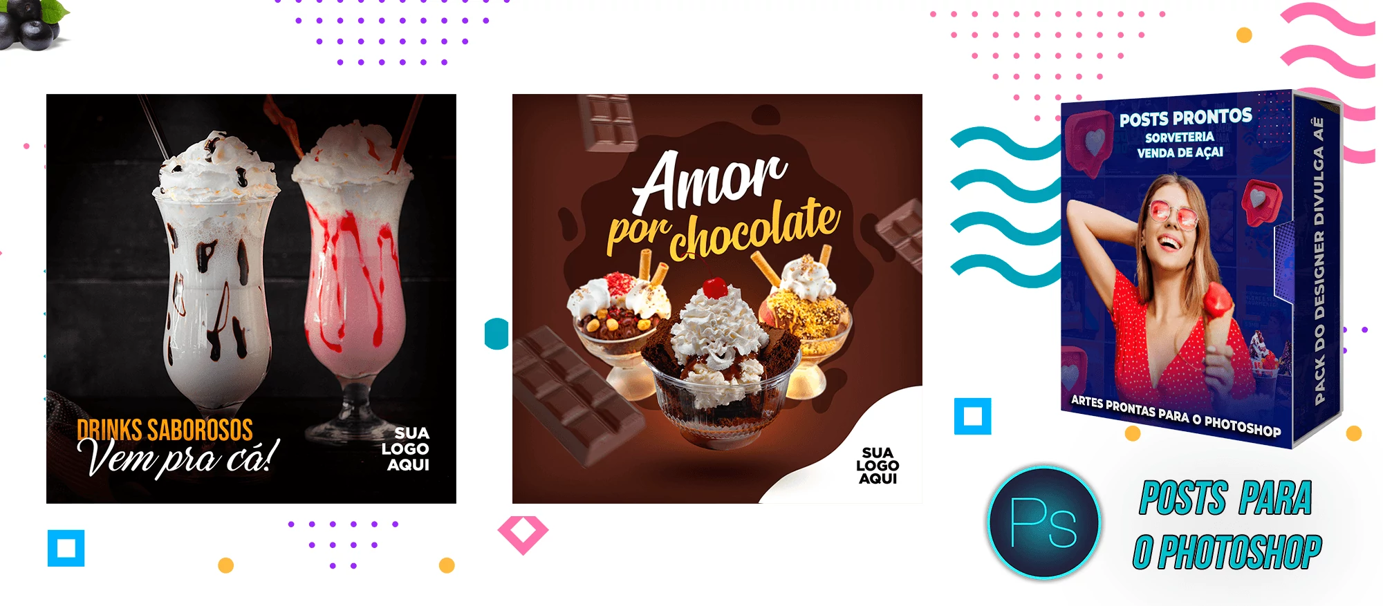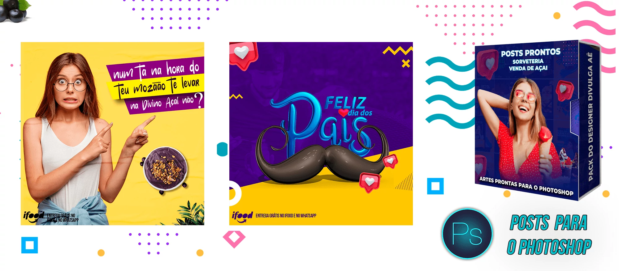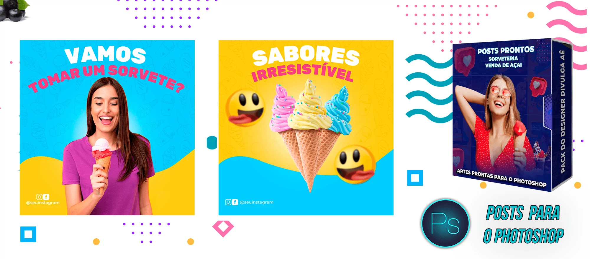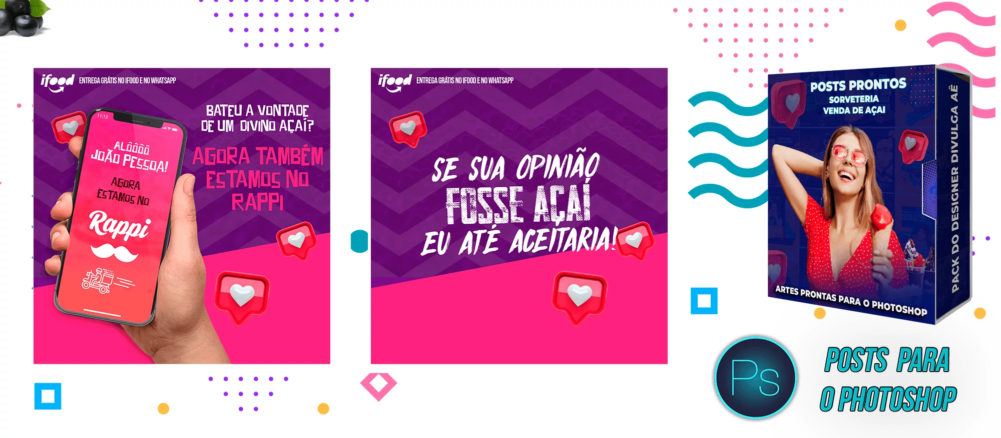 Pack de Posts Prontos e Legenda – Venda de Açai e Sorveteria no Photoshop