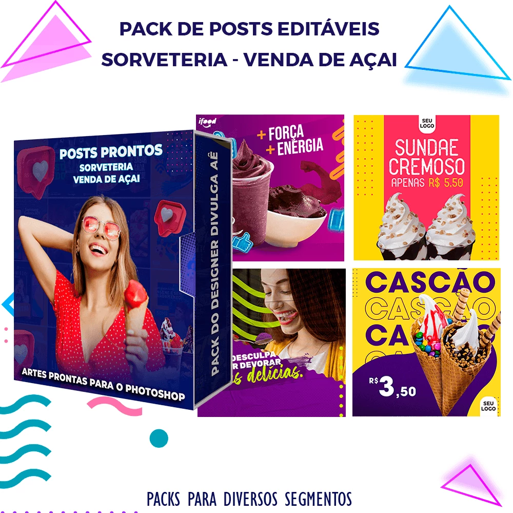 Pack de Posts Prontos e Legenda – Venda de Açai e Sorveteria no Photoshop
