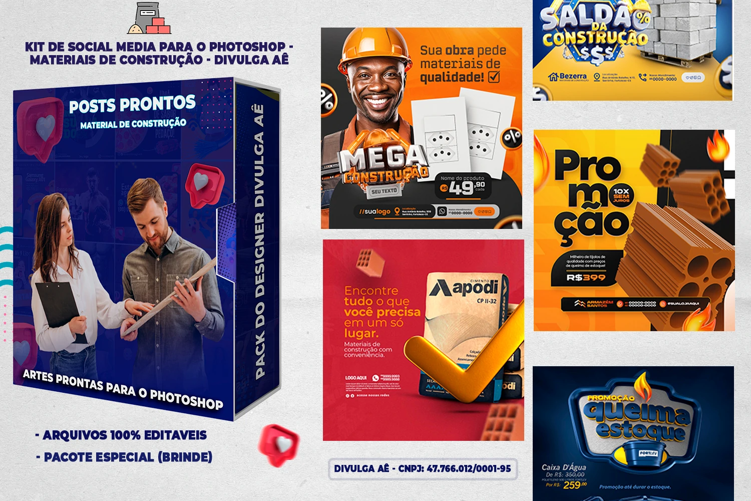 Pack elaborado sob demanda para Casas de Materiais de Construção, construtoras ou  Depósito de Construção com + de 500 Artes incríveis, que vai promover a sua empresa ou agência. Para editar o arquivo basta apenas possuir o  Photoshop  para editar o Arquivo colocar a marca da empresa, alterar o nome, e adicionar o WhatsApp, tudo em poucos segundos!