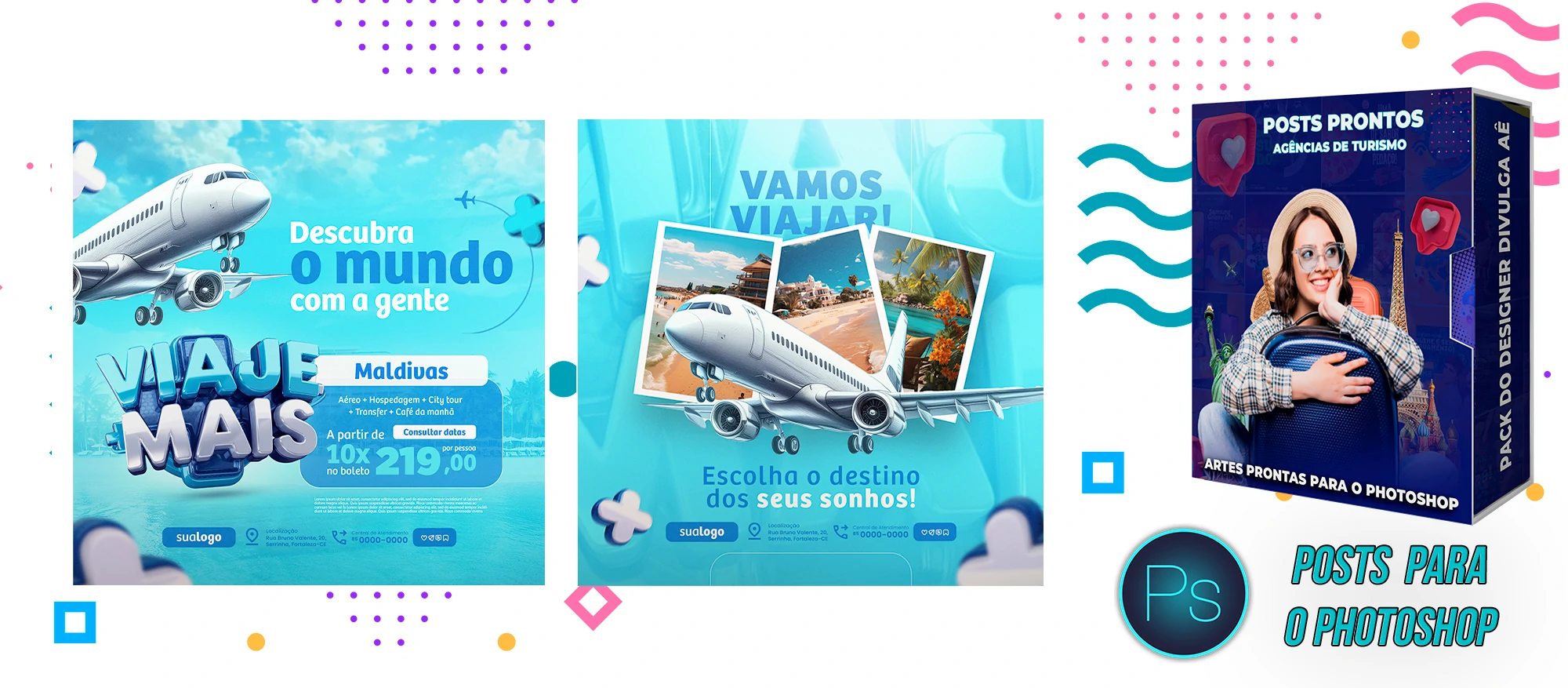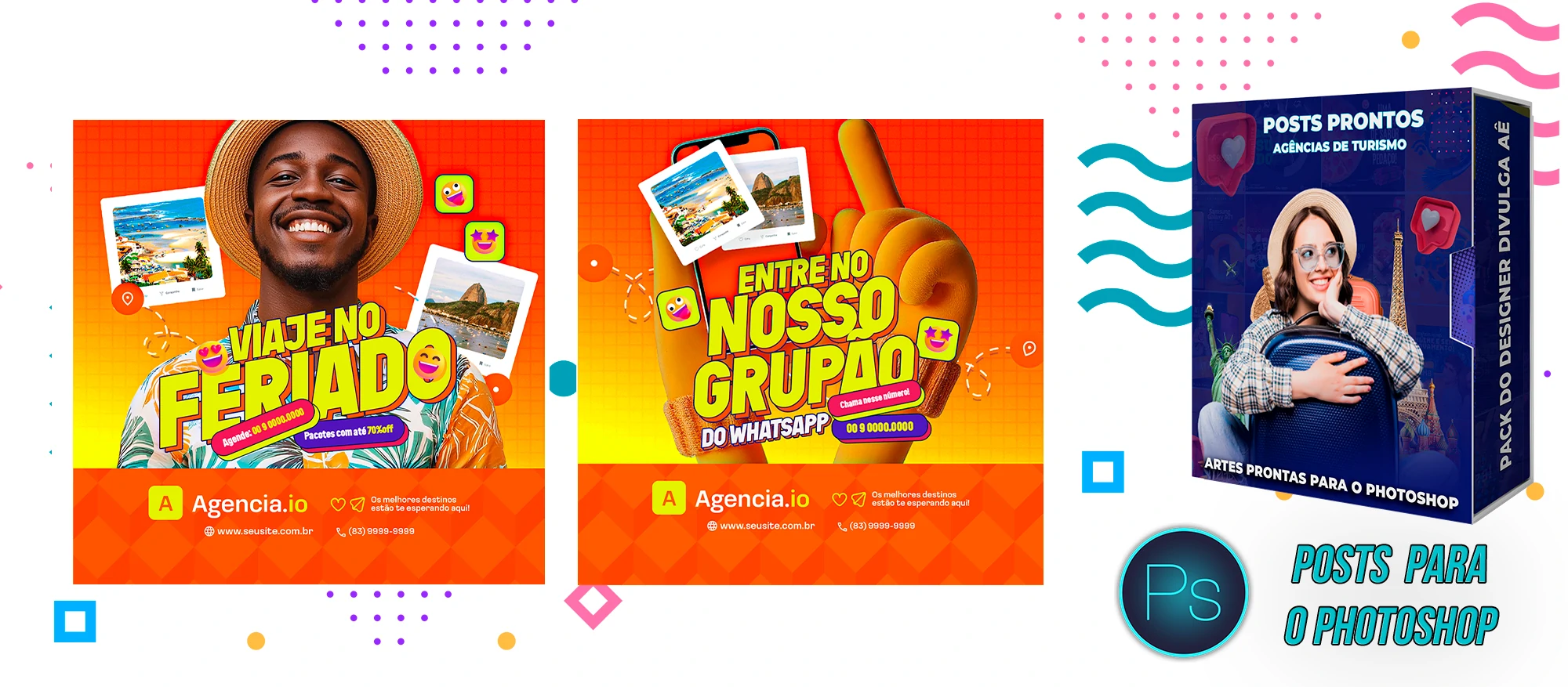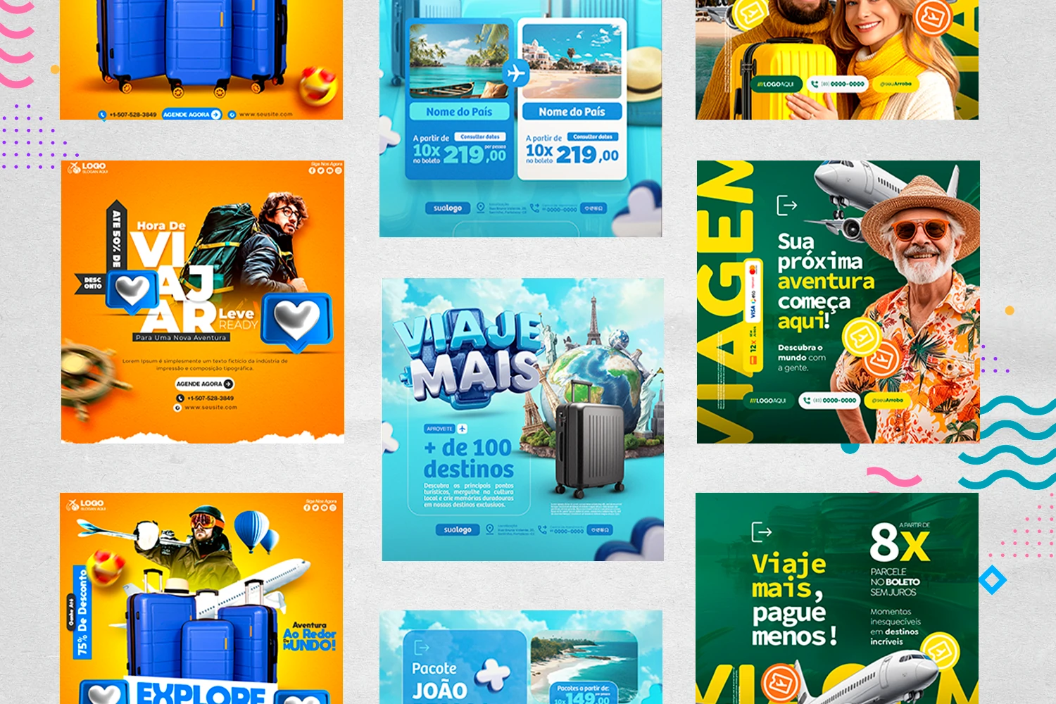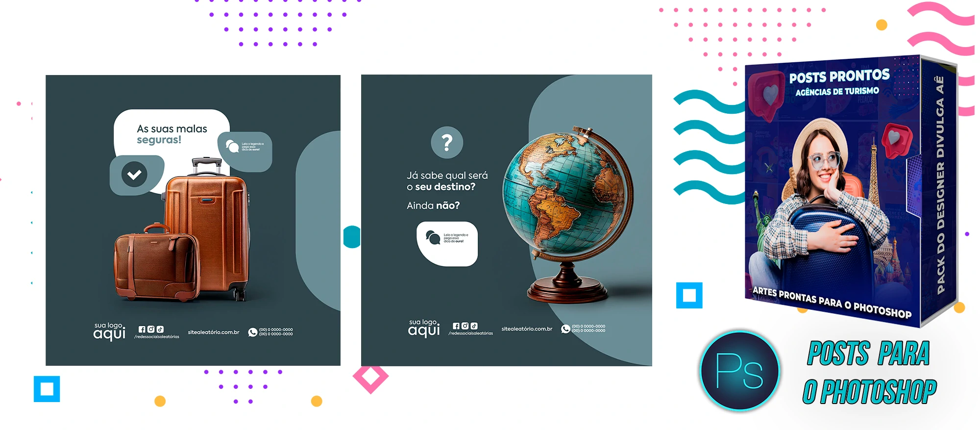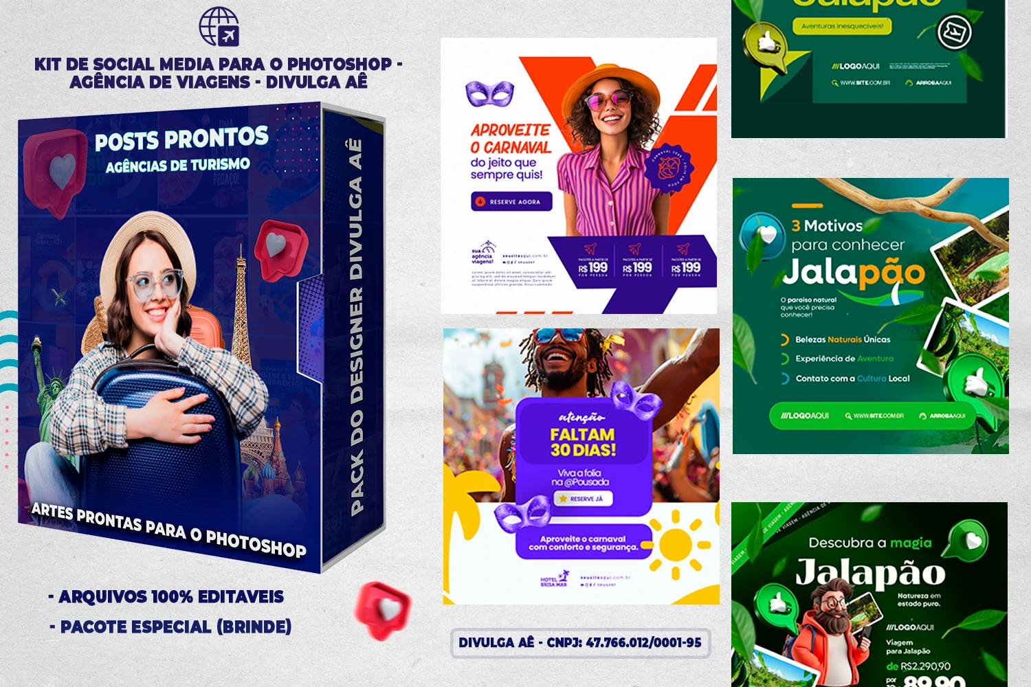 ✈️🌍 Pack elaborado sob demanda com mais de 240 posts para Agências de Viagem e Turismo, ideal para quem precisa criar conteúdos de forma rápida e prática. Basta editar os arquivos no Photoshop, inserir a marca, alterar o nome e adicionar o WhatsApp — tudo em poucos segundos! ⚡