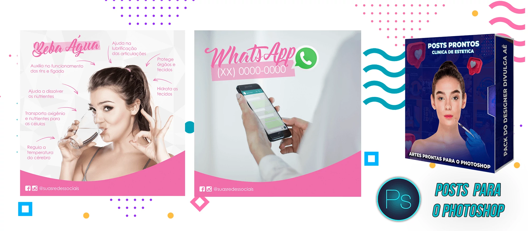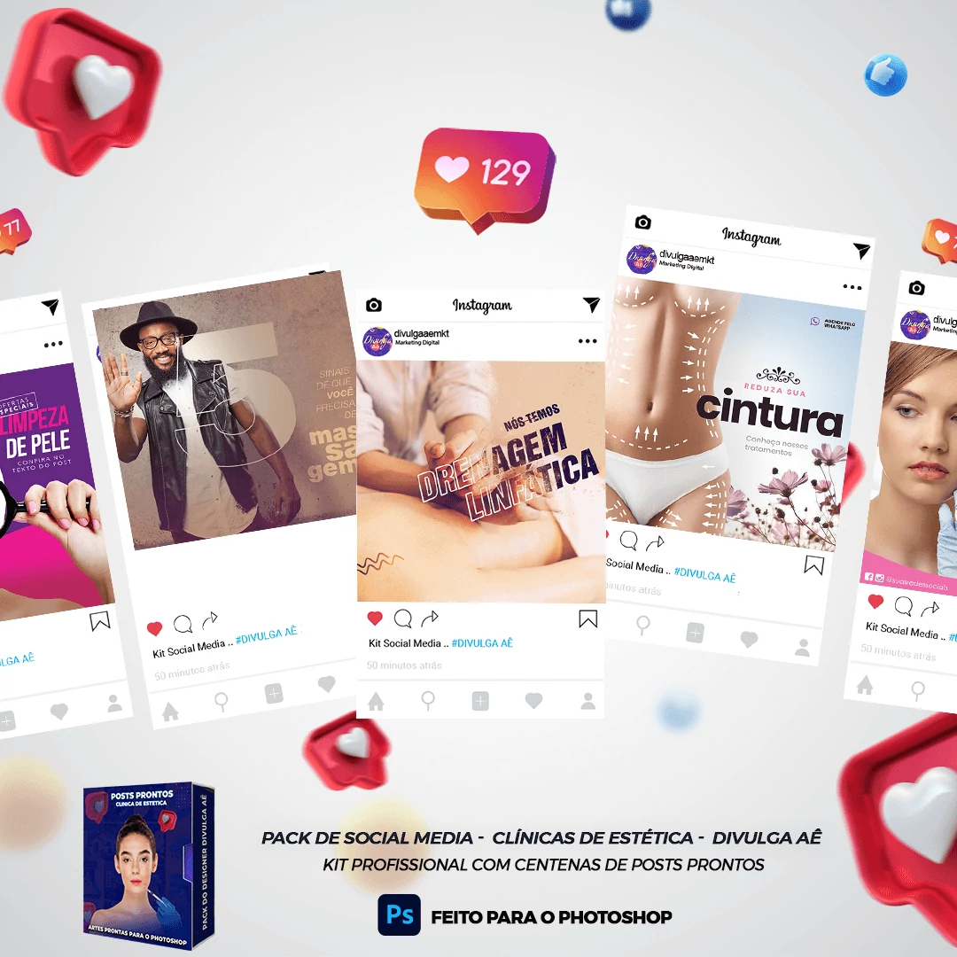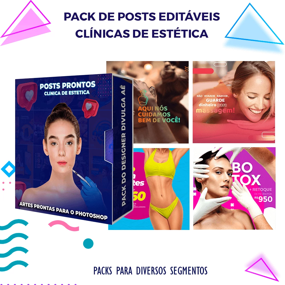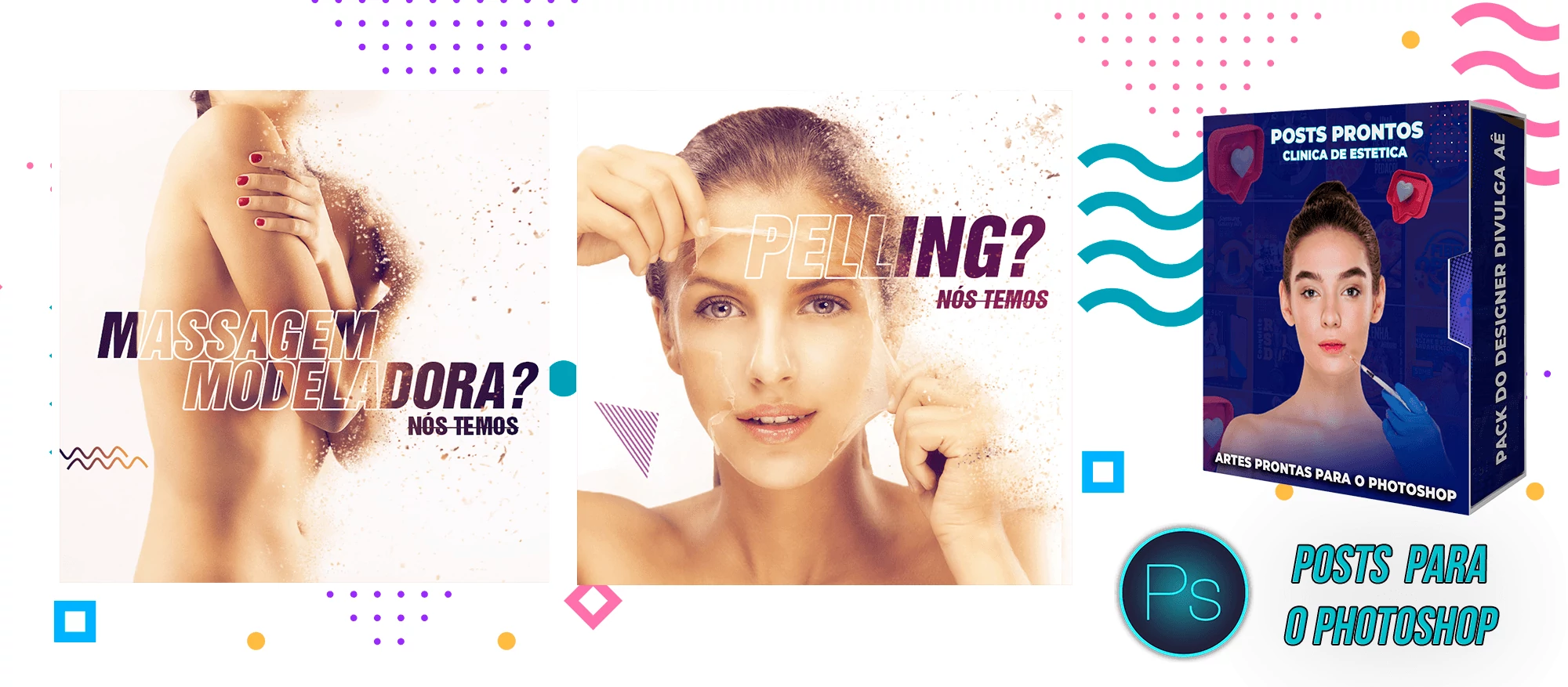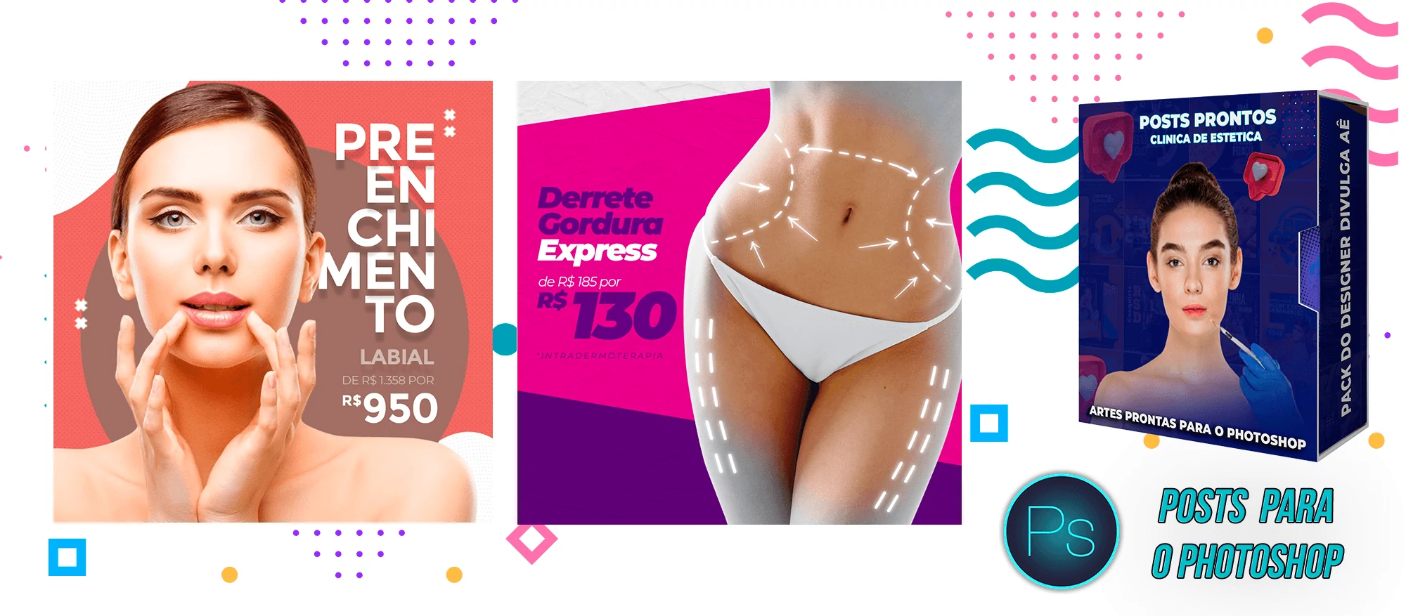 Pack elaborado sob demanda com mais de 250 Posts para Clínicas, Centros de Estética/Cirurgia Plástica que precisa elaborar posts de forma rápida e prática, bastando apenas possuir o Photoshop editar os arquivos e colocar a marca da empresa, alterar o nome, e adicionar o WhatsApp, tudo em poucos segundos!