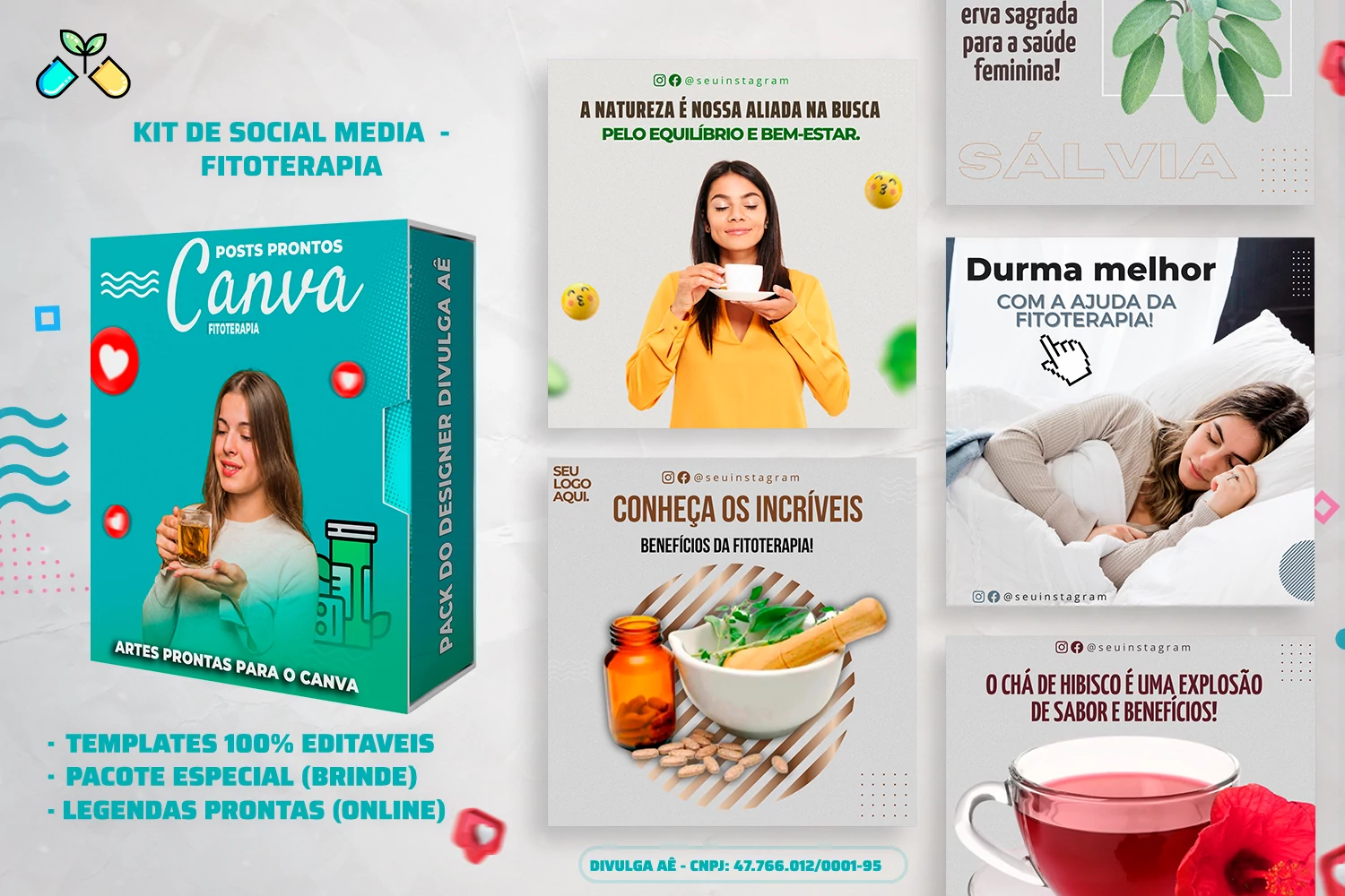 🌿 Conheça o Pack Exclusivo sobre Fitoterapia, com mais de 100 Artes Editáveis incríveis! 🌱🍃Simplifique sua comunicação e compartilhe conhecimentos sobre fitoterapia com templates prontos e personalizáveis, elaborados sob demanda especialmente para esse tema. Com a praticidade do Canva e uma conta gratuita, você poderá editar os templates em poucos segundos!