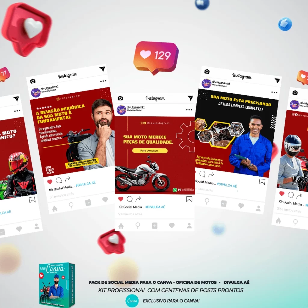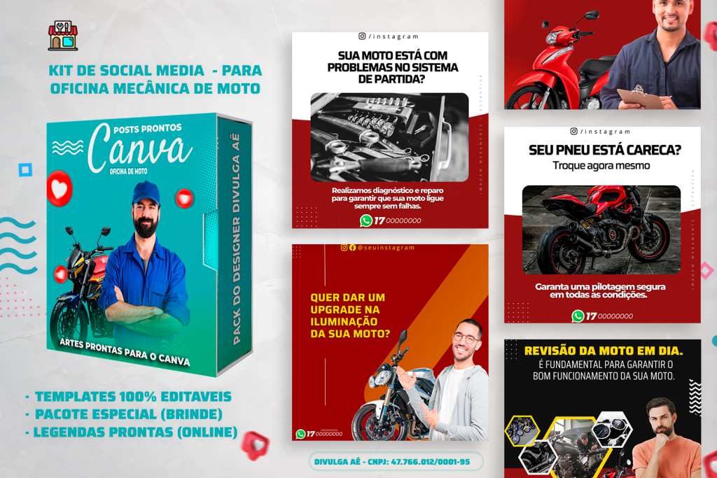 🏍️ Conheça o Pack Exclusivo para Oficinas Mecânicas para Motos, com 250 Posts Editáveis incríveis! 🛠️🔧 Simplifique sua comunicação e promova sua oficina com templates prontos e personalizáveis, elaborados sob demanda especialmente para oficinas mecânicas de motos. Com a praticidade do Canva e uma conta gratuita, você poderá editar os templates em poucos segundos!