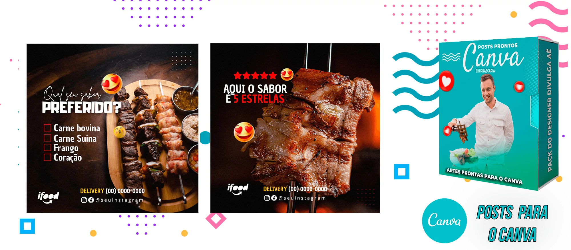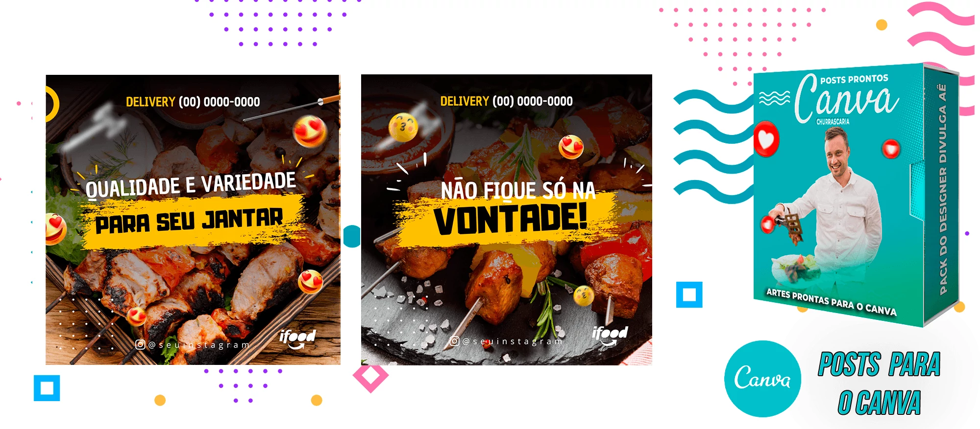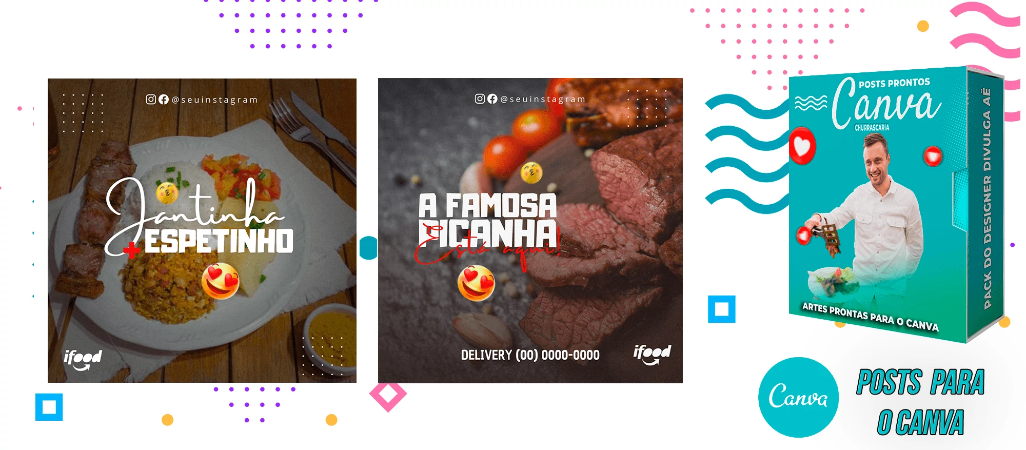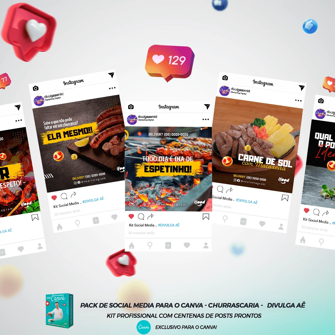 Pack elaborado sob demanda para  Churrascaria com 40 Artes Editáveis  incríveis.  Bastando apenas possuir o Canva  para editar o Template,  tudo em poucos segundos!