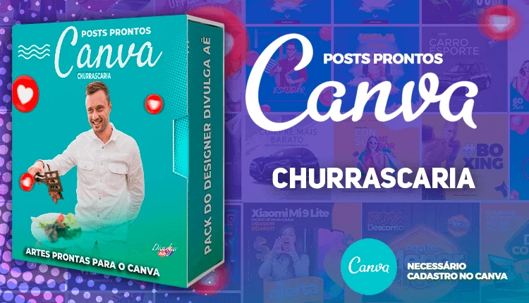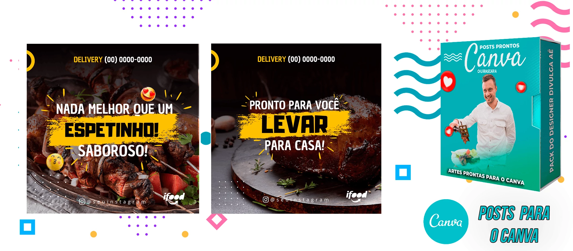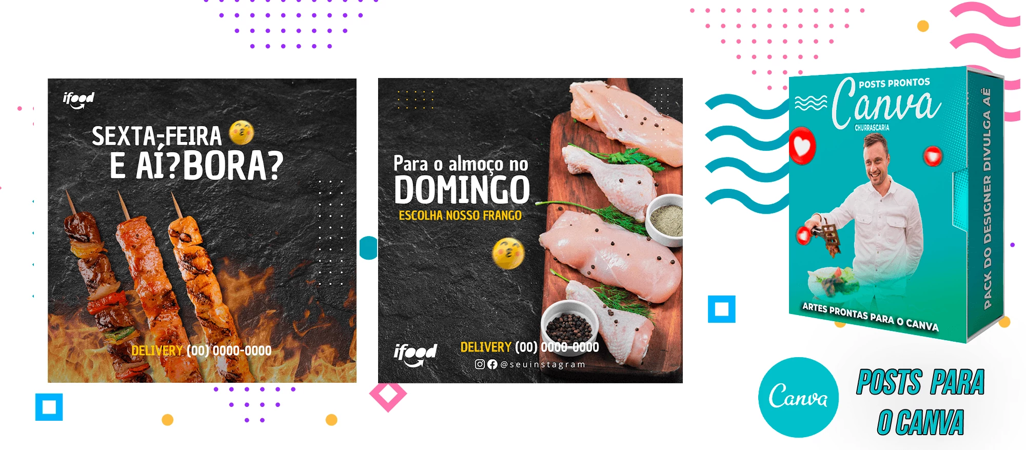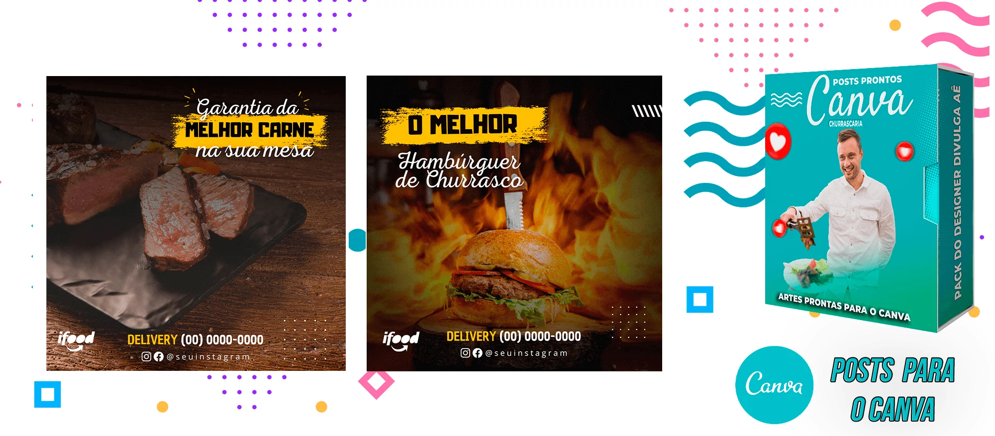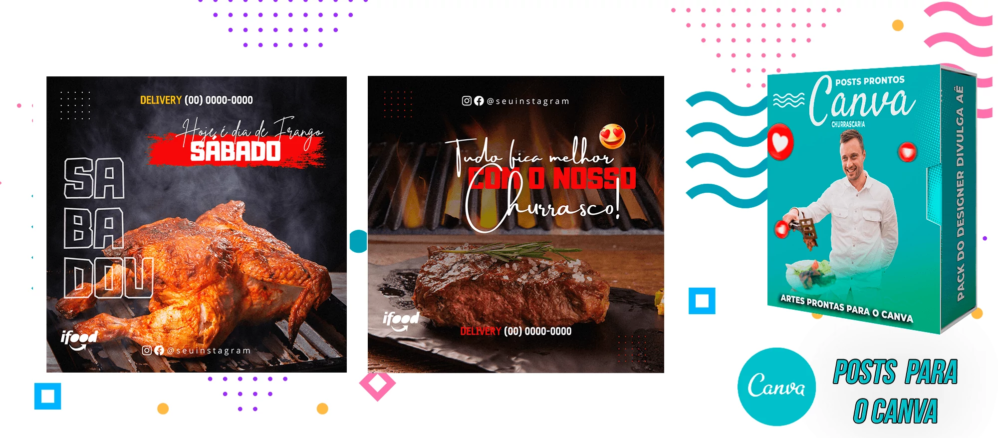 Pack elaborado sob demanda para  Churrascaria com 40 Artes Editáveis  incríveis.  Bastando apenas possuir o Canva  para editar o Template,  tudo em poucos segundos!
