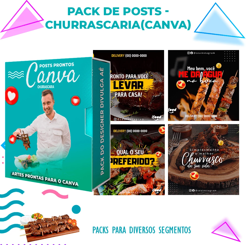 Pack elaborado sob demanda para  Churrascaria com 40 Artes Editáveis  incríveis.  Bastando apenas possuir o Canva  para editar o Template,  tudo em poucos segundos!