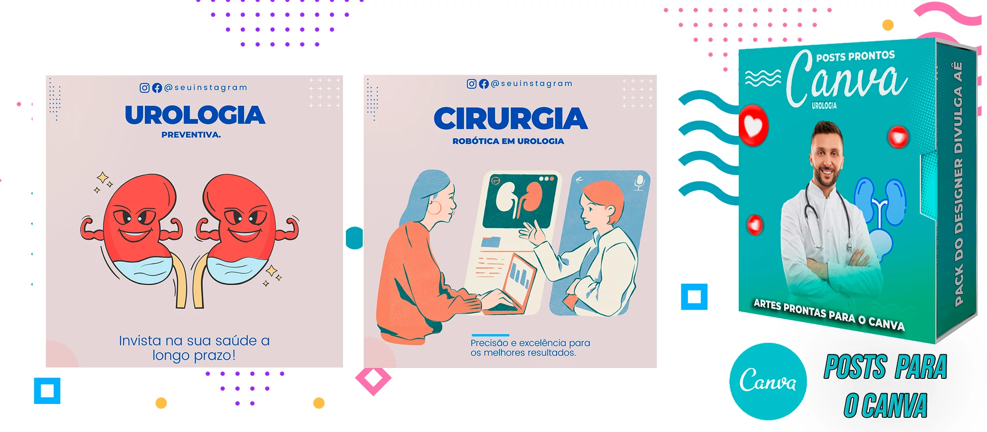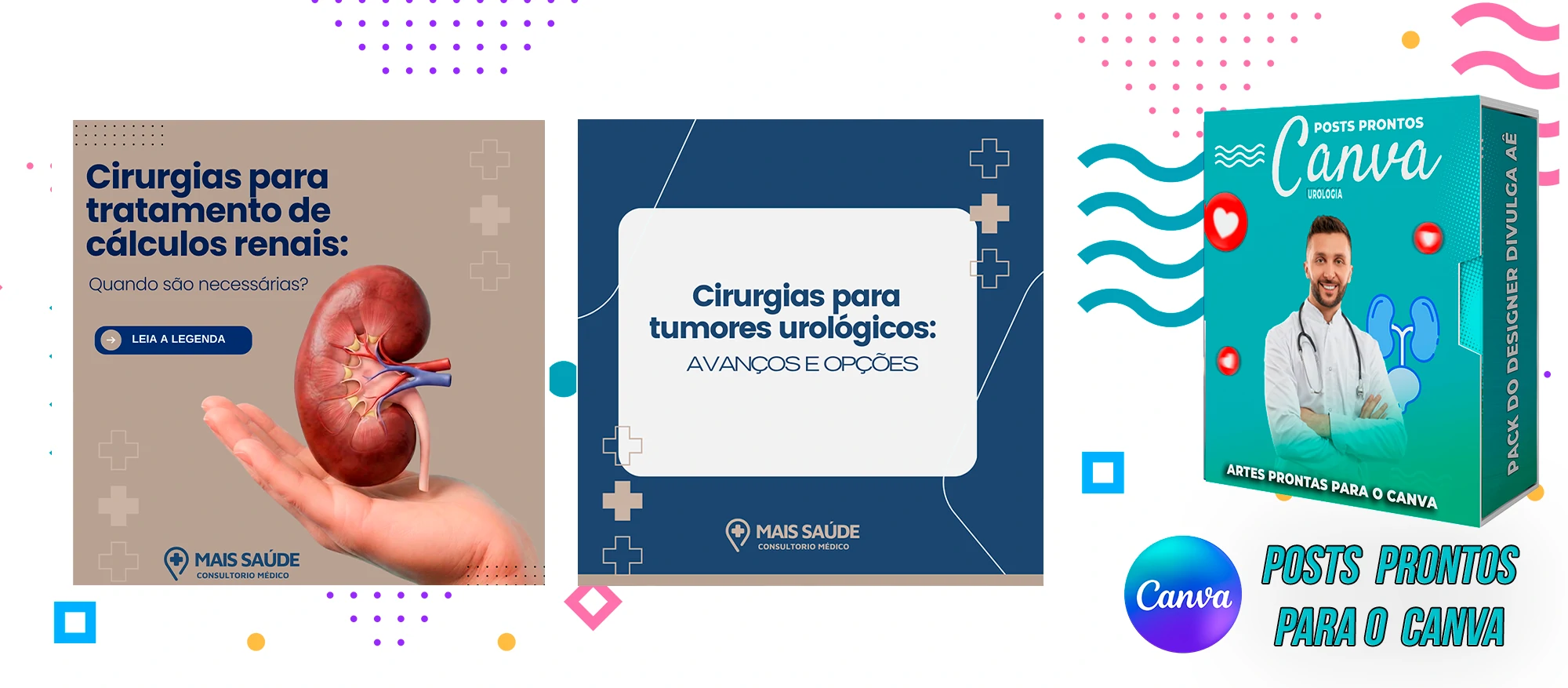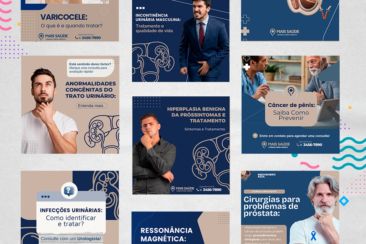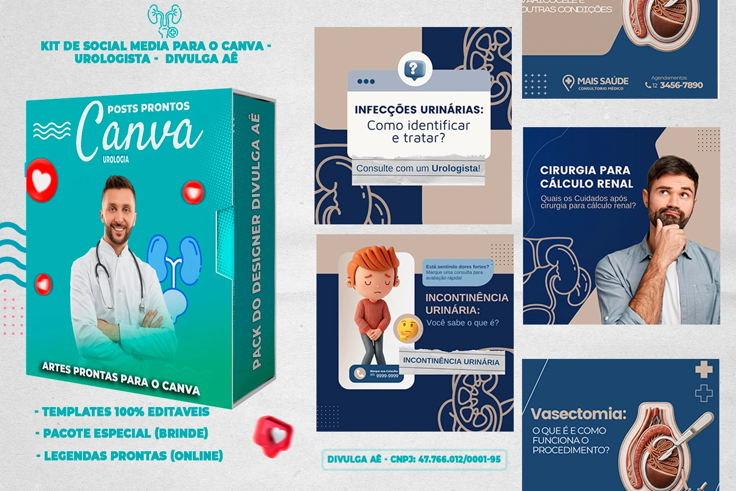 Encante seus pacientes com conteúdos profissionais e informativos, destacando a qualidade e a abrangência dos serviços médicos oferecidos. Essa ampla coleção de artes garantirá uma presença digital marcante e relevante na área da saúde. Não perca essa oportunidade! Eleve sua presença online, alcance mais pacientes da clínica médica ou consultório de urologia 🚀🏥👨⚕️