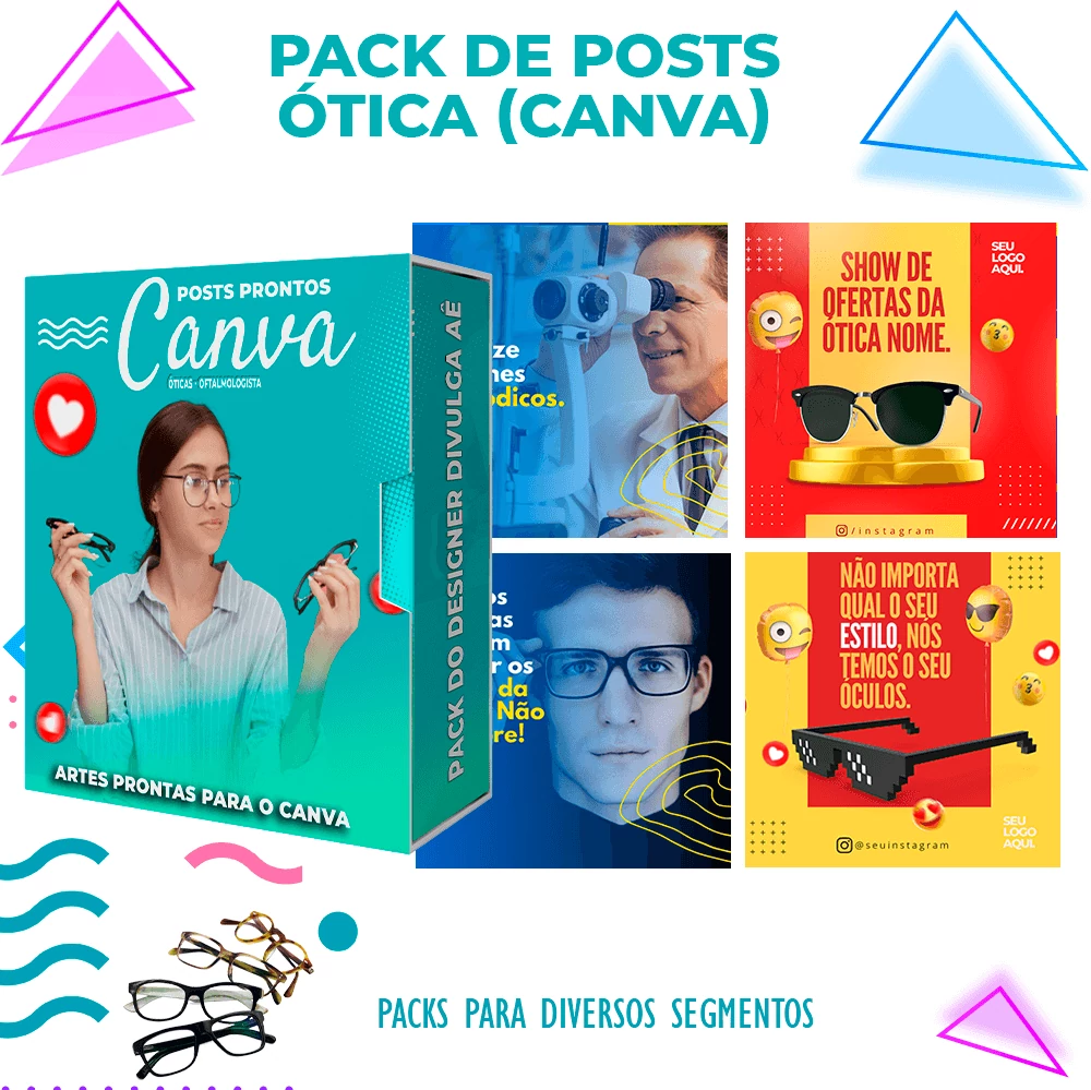 Pack elaborado sob demanda para Óticas com mais de 250 Artes + Legendas Editáveis incríveis. Bastando apenas possuir o acesso Gratuito Canva para editar o Template, tudo em poucos segundos!
