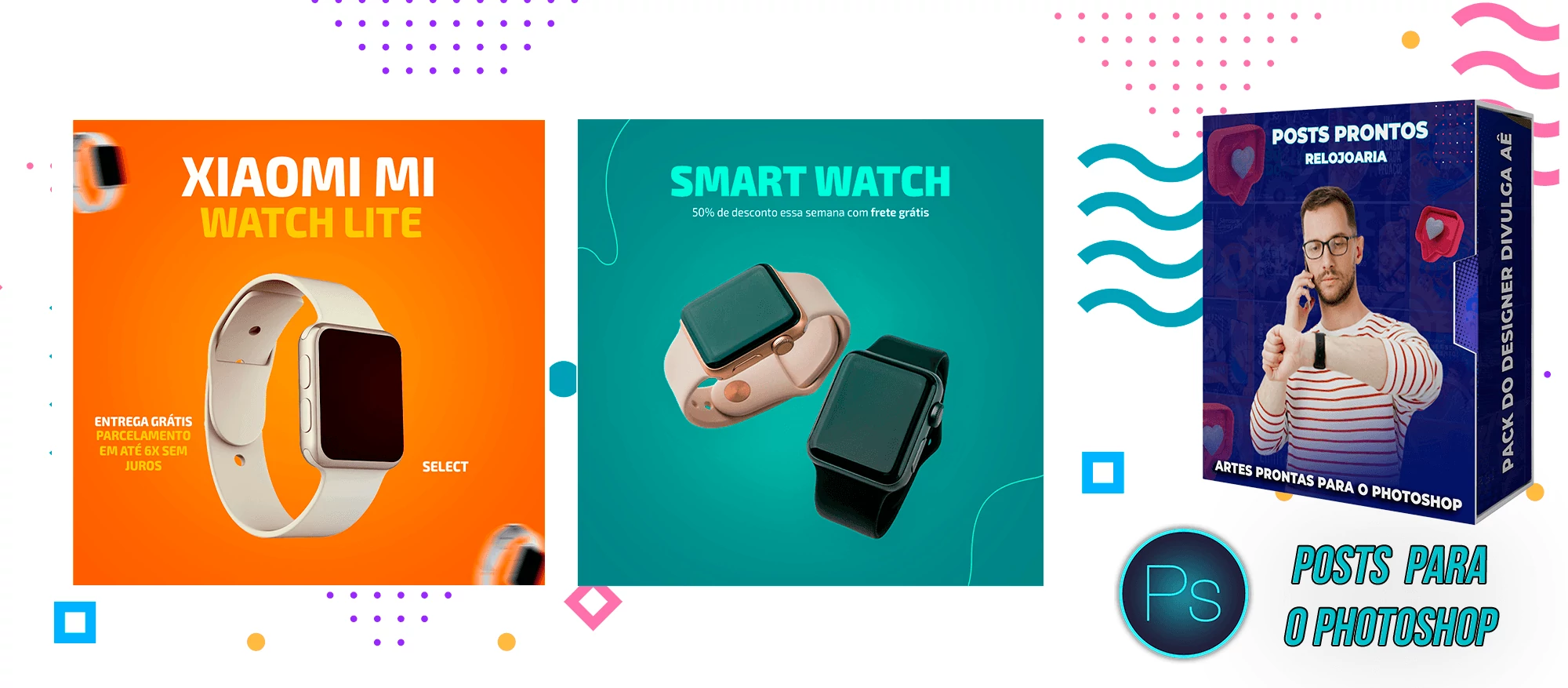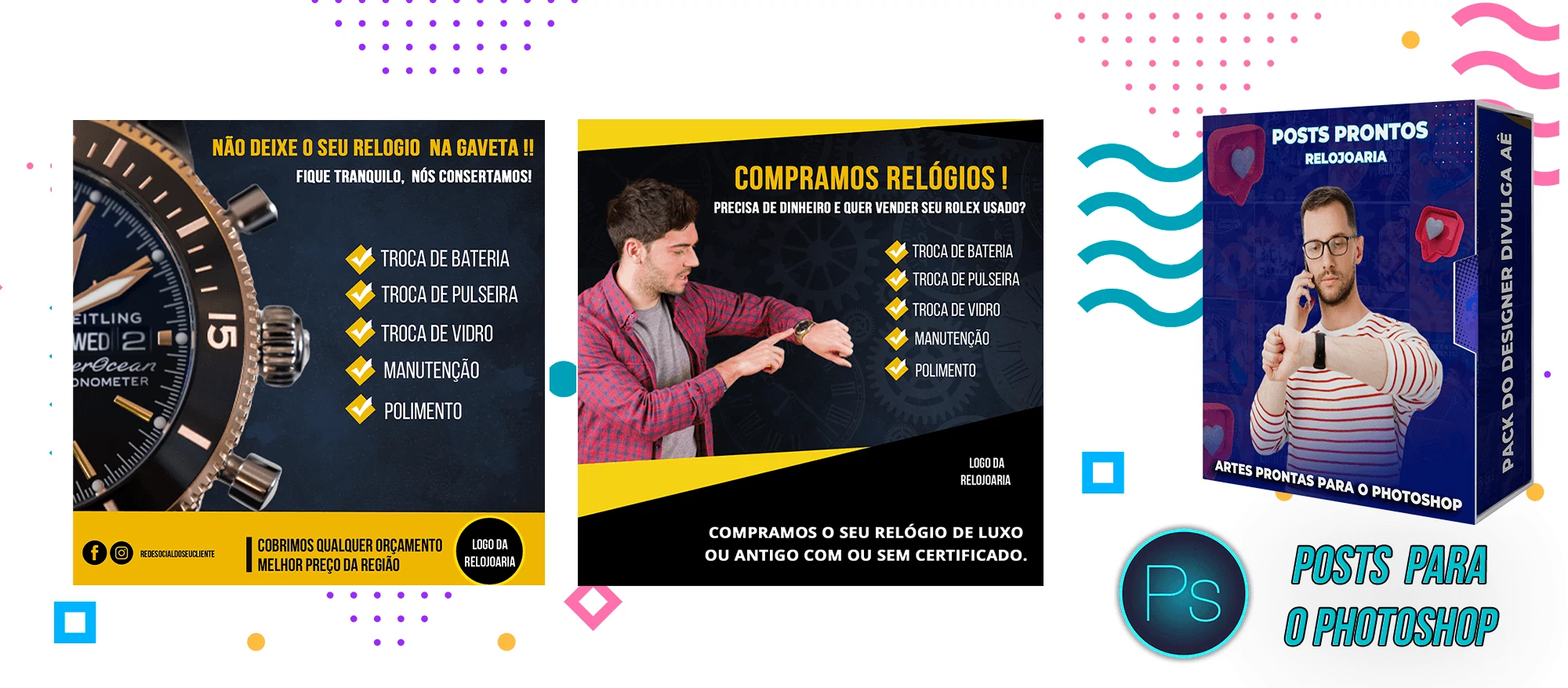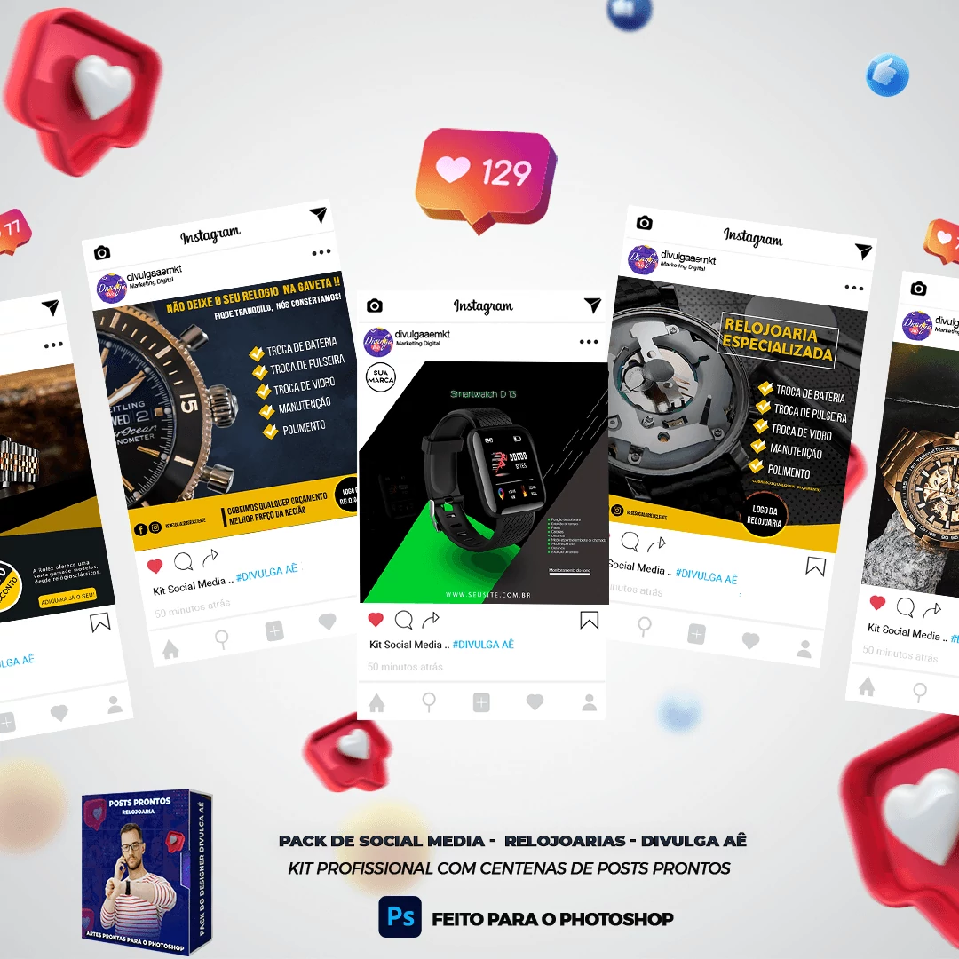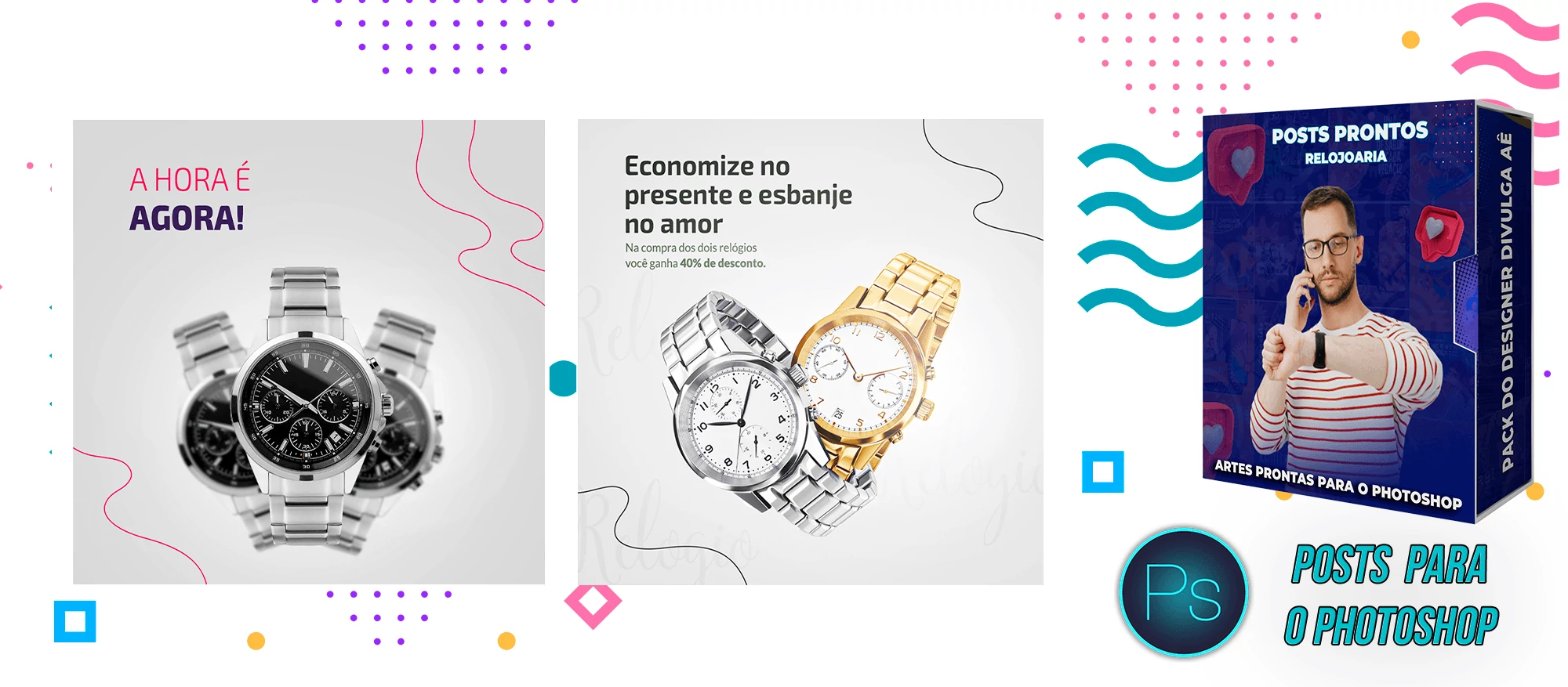 Pack elaborado sob demanda diversas artes para Relojoarias e Acessórios que precisa elaborar posts de forma rápida e prática, bastando apenas possuir o Photoshop editar os arquivos e colocar a marca da empresa, alterar o nome, e adicionar o WhatsApp, tudo em poucos segundos!