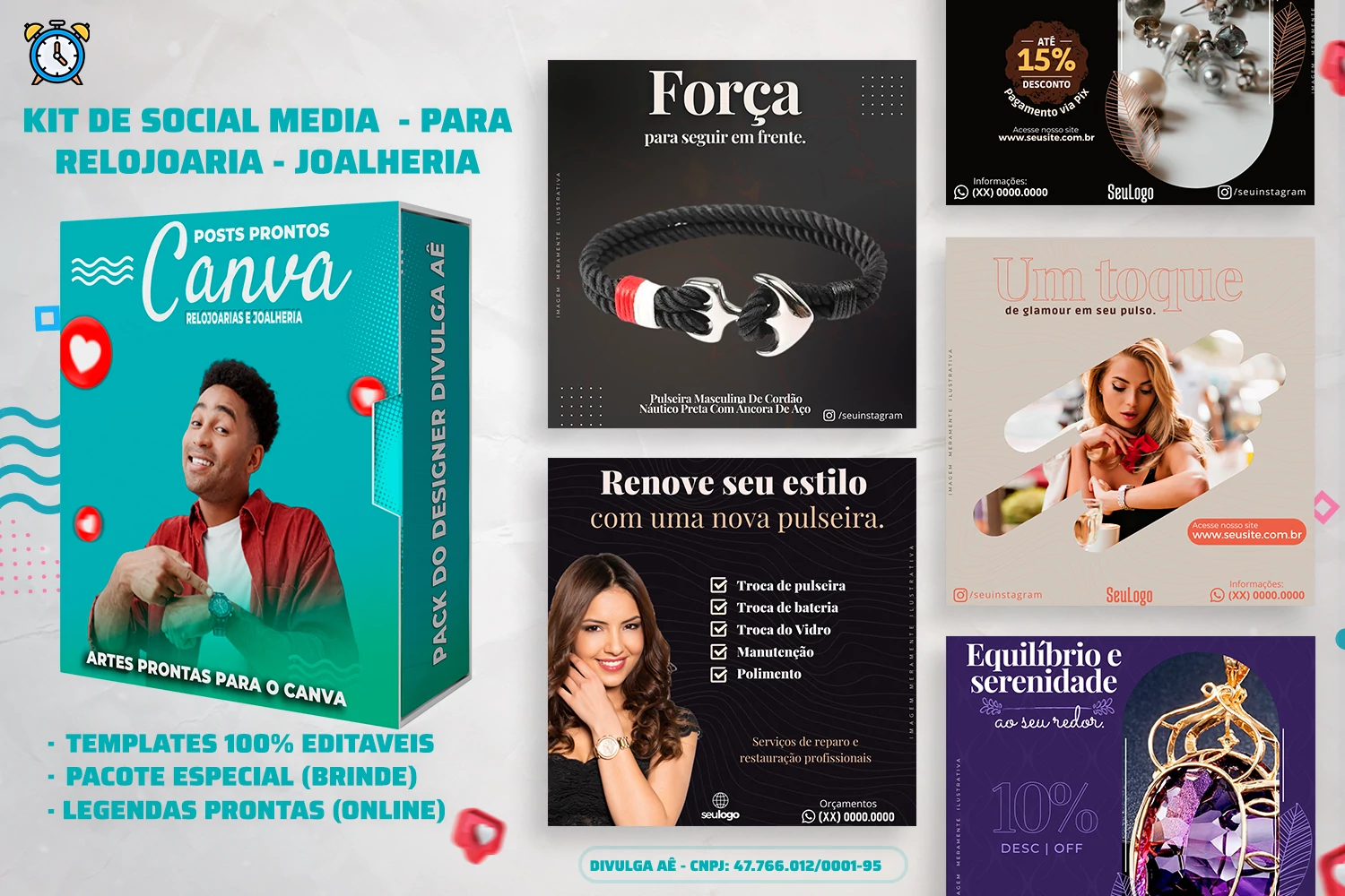 Encante seus clientes com conteúdos visualmente atrativos, destacando a beleza e a qualidade de seus produtos, como relógios, pulseiras, colares, brincos, anéis e semijoias. Essa ampla coleção de artes garantirá uma presença digital marcante e envolvente.Não perca essa oportunidade! Eleve sua presença online, alcance mais clientes e torne-se uma referência no mercado de relojoarias e joalherias. 🚀⌚💍