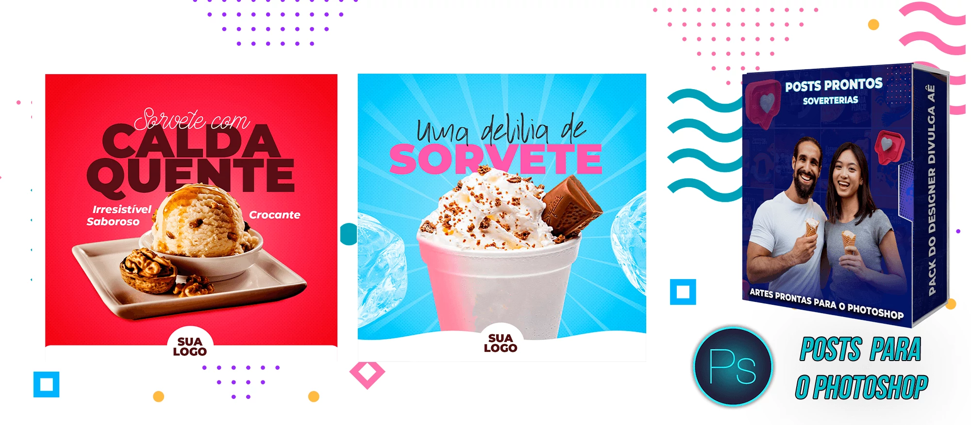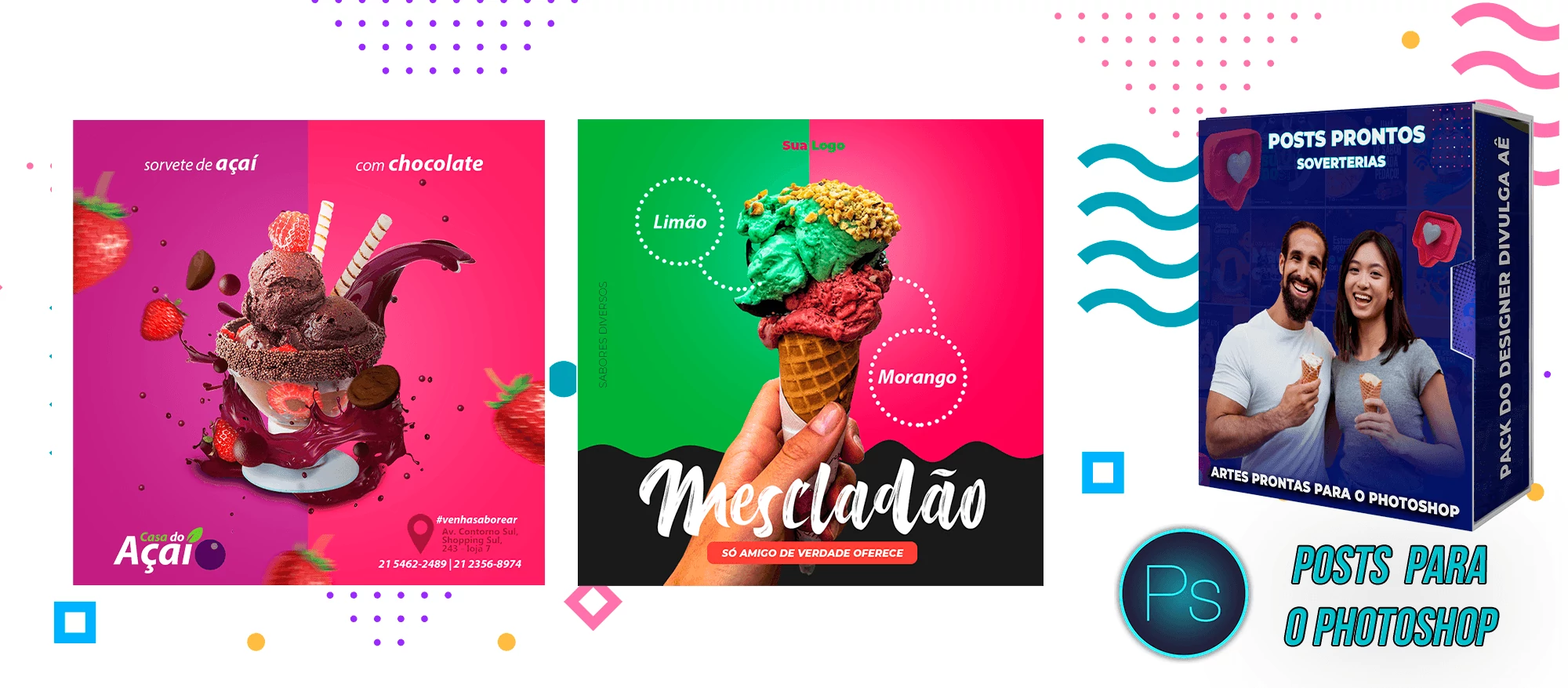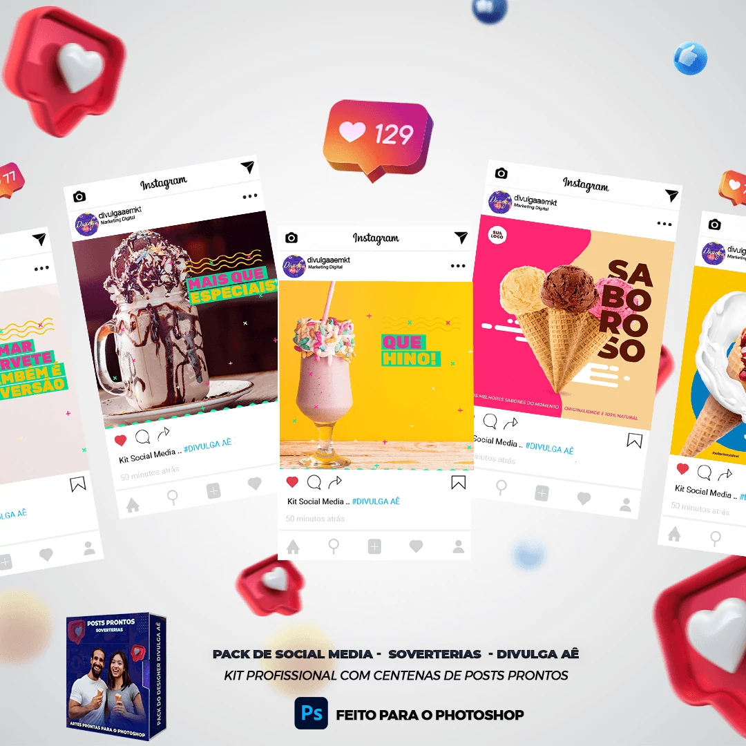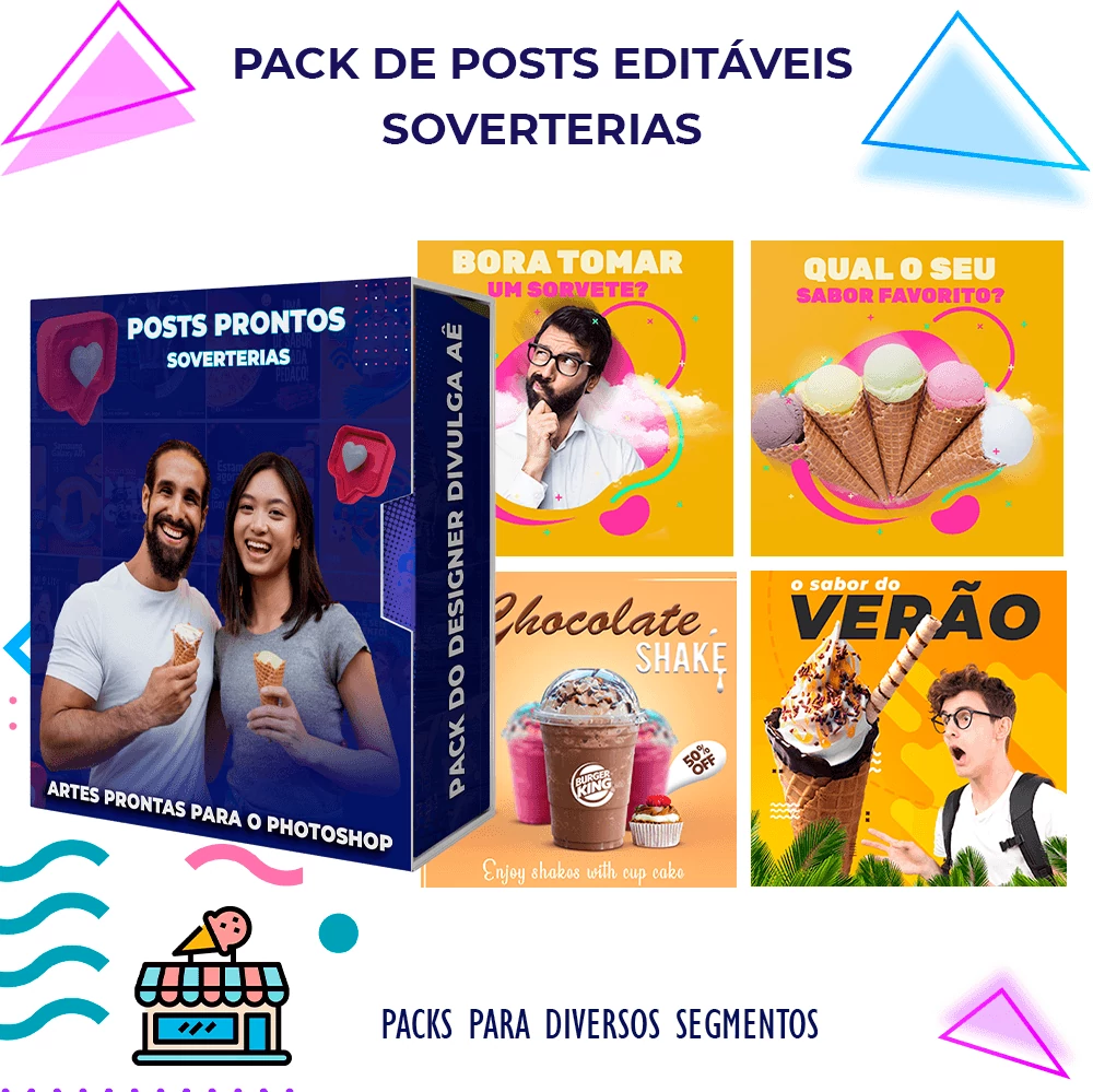 Pack elaborado sob demanda com 200 artes para Sorveterias que precisa elaborar posts de forma rápida e prática, bastando apenas possuir o Photoshop editar os arquivos e colocar a marca da empresa, alterar o nome, e adicionar o WhatsApp, tudo em poucos segundos!